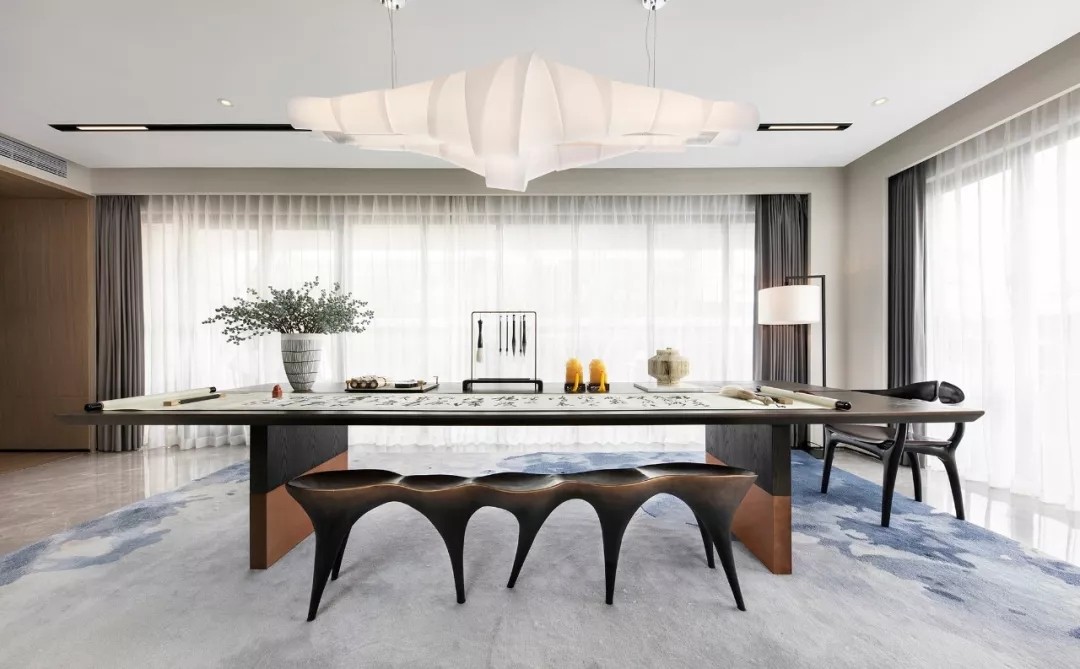 自水景庭院步入空间,书画创作交流区是居者艺术生活起笔的第一个诗意场域,摒弃了常规玄关的布设,设计师将书画空间营造为一个清朗雅隽的艺术生活方式安放地,超面宽的通透采光、大方疏阔的格局、宽大的面案桌台与米白色卷轴状的吊灯,丰富了诗性空间的柔和度。人在此间挥毫泼墨,写诗或绘画,艺术家的无垠想象力自由绽放。