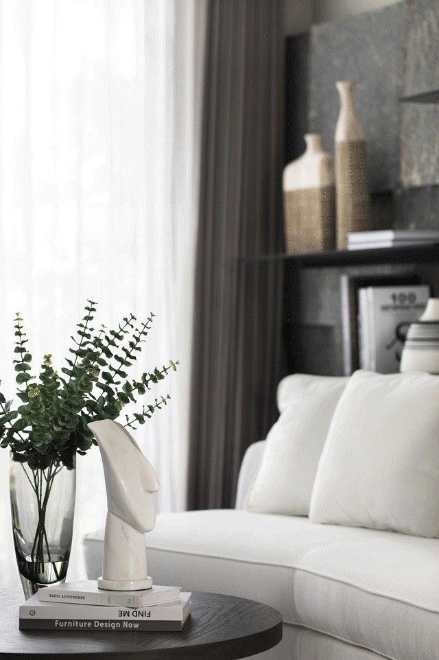会客空间意在营造一个温馨舒缓的惬意氛围,茶几与沙发组合以黑白色调为基准,简单纯粹,与水墨意境的抽象画设色一致而素雅。在形态塑造上,设计运用了一种全新的模式,背景墙在壁纸硬包的基础上,增添了三分之二的毛面石材,将自然的粗犷与生活的温柔巧妙地融合为一体,实现了绝妙的无缝对接。空间之中既有分明的棱角,又有柔和的弧线,在光与影、虚与实的映照下,层次与线条交织出新的诗意。