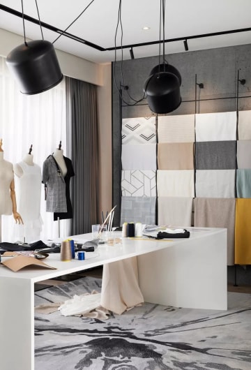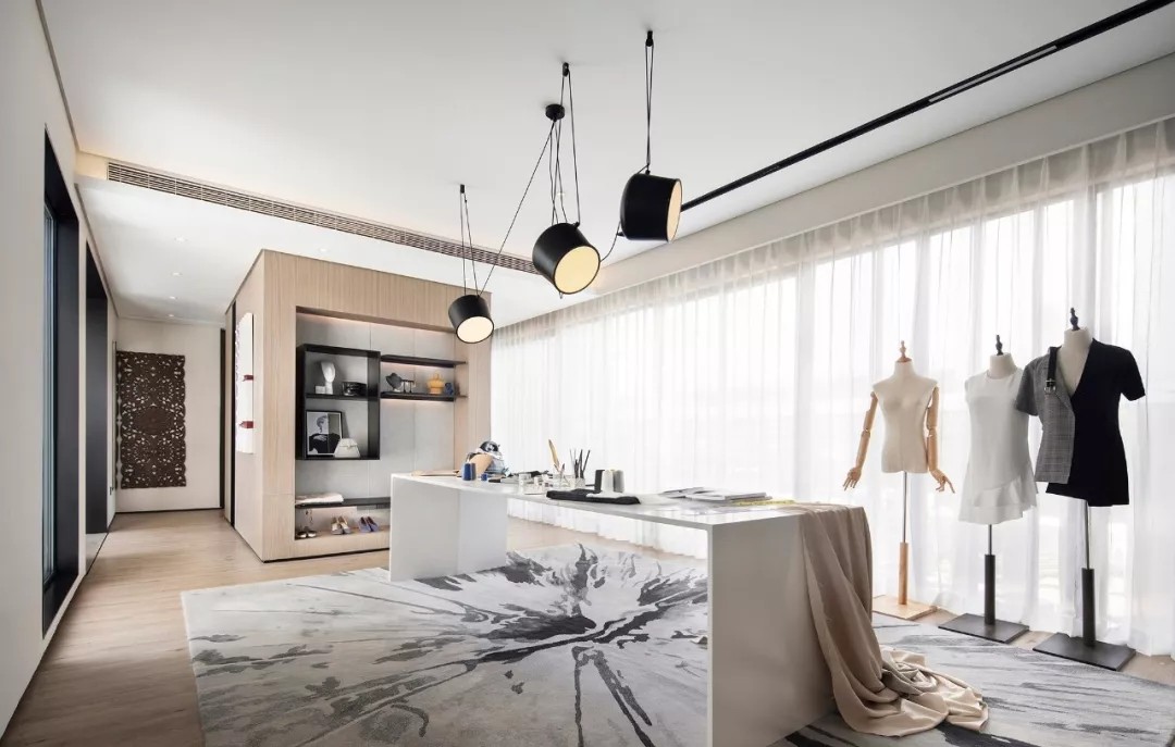 工作室是主人恣意展现才华的地方,设计将艺术家的表现力与浸染力发挥得淋漓尽致,将时尚的潮流感更好地呈现出来,延续了整体的诗意情调,规整的况味与不规则的诗意于碰撞中新生韵致。纯白色的工作台、泼墨写意的地毯、极具现代感的灯饰,搭配简繁有致的面料架与人形立台等工作所需物件,以优雅的造型表达出主人对生活的品质追求,令整个空间充盈着艺术创作的活跃气息。