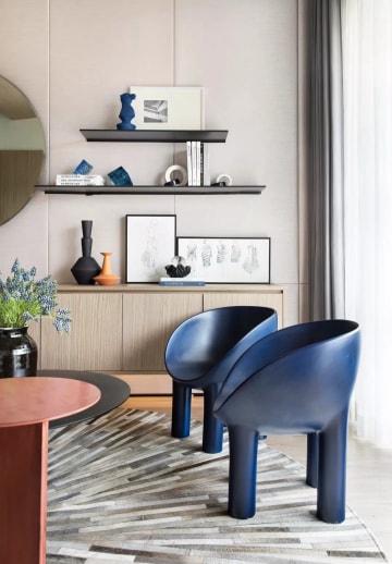 空间的整体规划自然而利落,浅色的原木地板与阅读的休闲质感相融相协,在空间设色上采用了跳跃式的色彩来烘托气氛,红色茶几与宝蓝色矮凳成为空间最吸睛的点缀,加之精致的小装饰,让阅读空间显得更加亲切。镜面关系的视角运用,展呈方正之间的阔绰大气,圆融之间的温柔恬淡,交融呼应出生活的本真,更交叠出空间诗意的层次感。边几和落地灯则有着统一的金属质感,柔和灯光撒下一室恬静与美好,为每一个角落都赋予了艺术的气息。