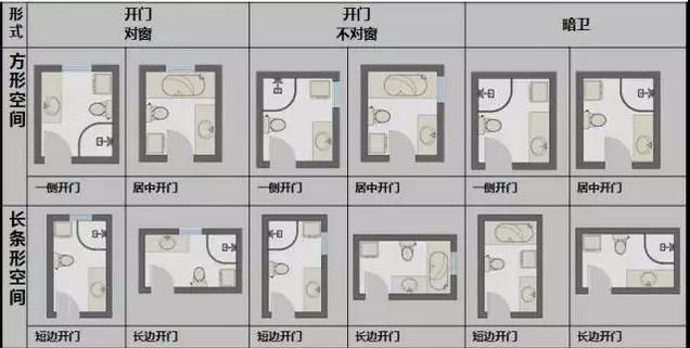 不同卫生间空间对应的布局方式不同,长方形空间按照日常动线和使用频率排列3大功能区,避免动线交叉;