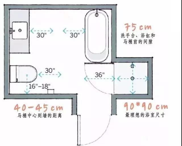整个平面布置,卫浴洁具之间最理想的空间距离,参考下图: