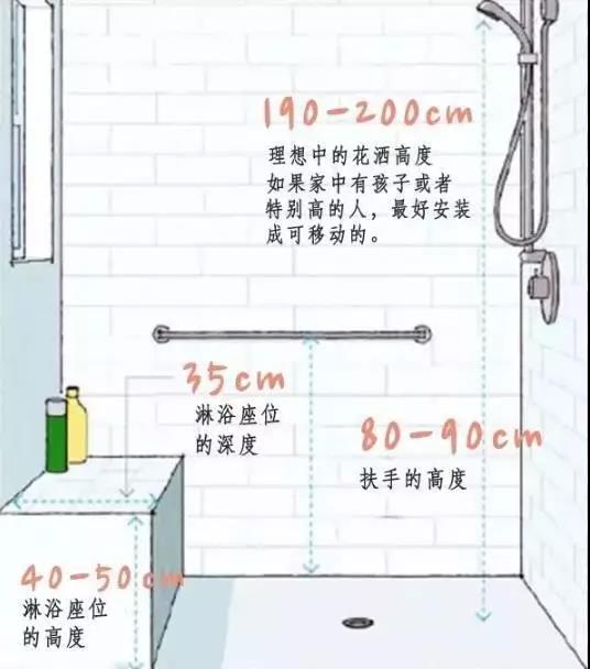 按照人体工程学,淋浴房使用最舒适的大小尺寸,以及搭配使用的花洒、淋浴座位、扶手等尺寸,参照下图: