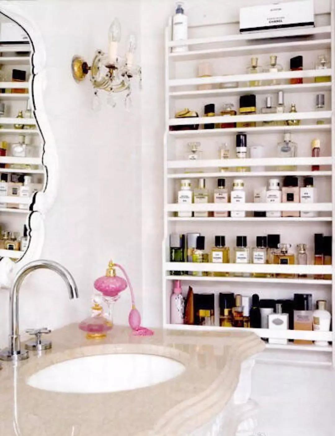 墙面凿洞是比较有视觉冲击感的卫生间扩容方式,可以设计在淋浴间或者浴缸边上放沐浴用品,也可以设计在盥洗台边上摆放护肤品&化妆品。