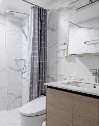 既可以选择通透的玻璃材质,保障卫生间的光照和通风,也可以直接装个浴帘达到简单的分隔效果,这种小户型最适用;