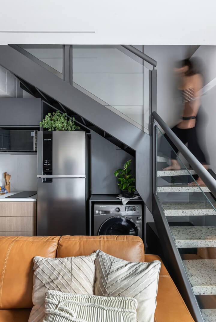 小空間內設計師利用不同的家具作為領域的界線。公寓內有一個「社交」區域,以一個漂亮的鏤空架和電視櫃組構而成,層架的側面鏤空呈現,視覺上輕盈許多且與壁面彷彿無縫銜接般,並能容納馬克杯、玻璃杯、咖啡機、製冰機和許多其他小型家電,增加收納空間。樓梯下的空間也不浪費,整齊的廚房旁整合了冰箱、洗衣機及儲藏空間。而電視櫃及廚房之間形成的空間,擺進了沙發及帶有四個座位的餐桌,提供休息、聚會需求。