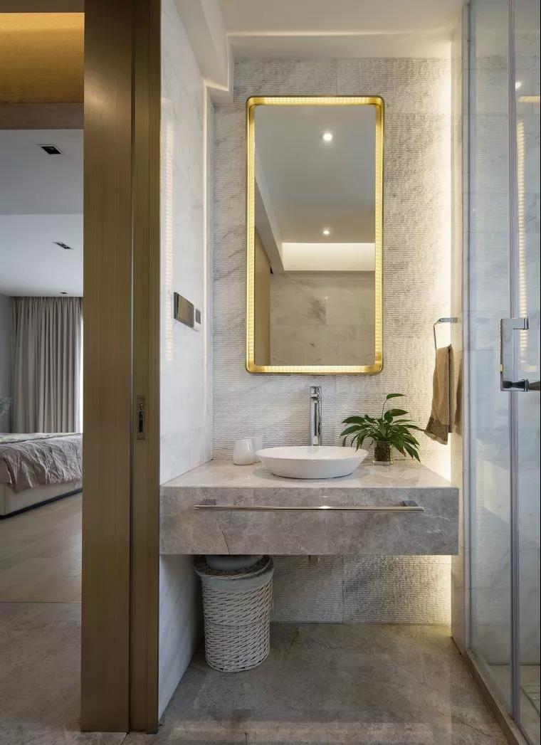 这种干湿分离法,把洗脸台单独隔离出去,变成彻底的干区,如下图这样↓
