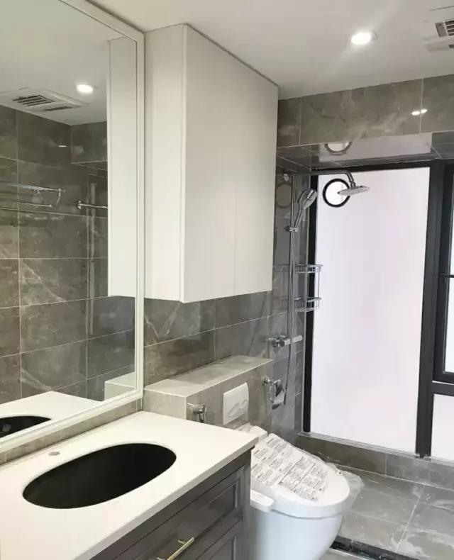 另外浴室柜上方要装一个大点的镜柜,为什么要大呢?一是镜面大能扩大视觉空间,二是增加收纳空间,护肤品、化妆品啊都可以塞进去下方浴室柜台面也能整洁不少。