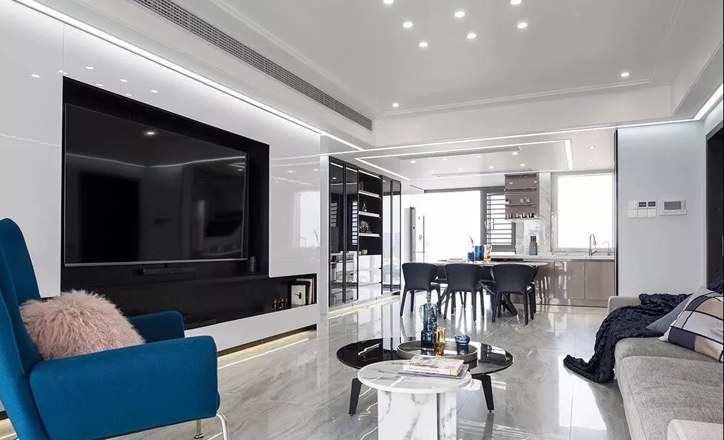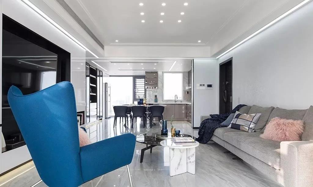 ▲ 客厅,蓝灰色家具搭配石材茶几,简约的吊顶采用点光源与灯带的形式取代传统主灯,空间更加现代时尚