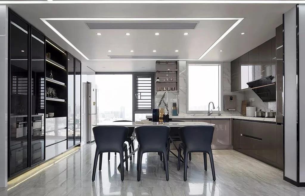 ▲ 餐厅,白色烤漆和黑色玻璃材质搭配灯光完美融合,既是墙面装饰又是储物柜,出乎预料的简单、时尚