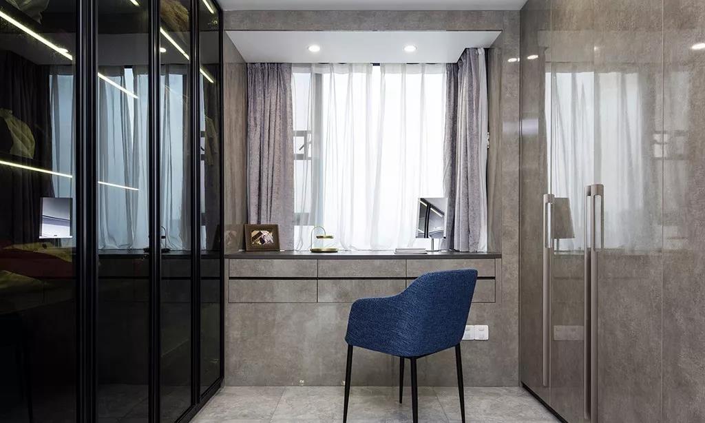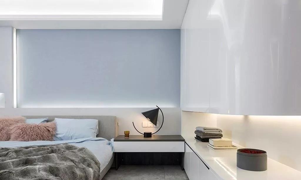 ▲ 主卧延续中性色彩,以白色烤漆面板和灰蓝色墙漆的组合造型作为卧室背景