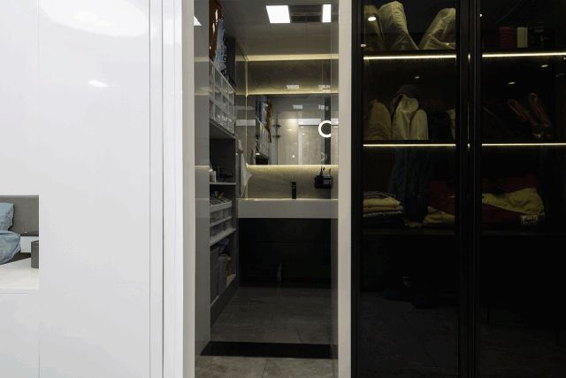 ▲ 客卫整体通铺石色瓷砖,隐形光源的墙镜增加现代感,黑白灰的配色经典耐看