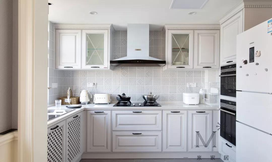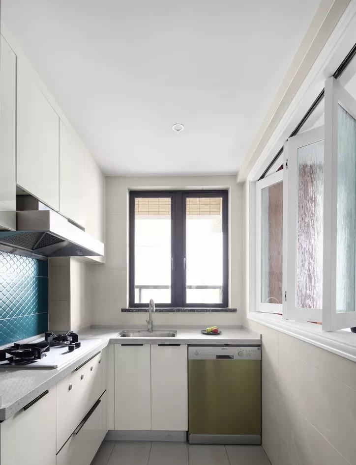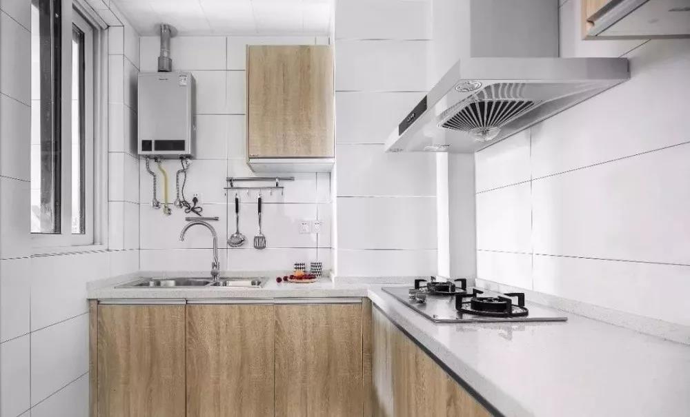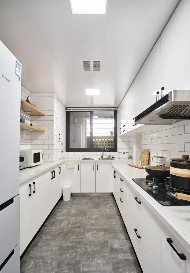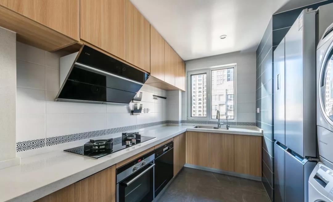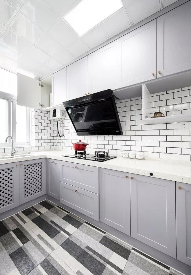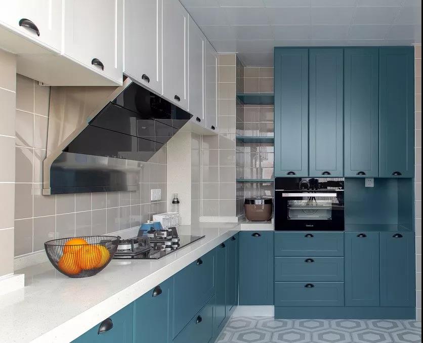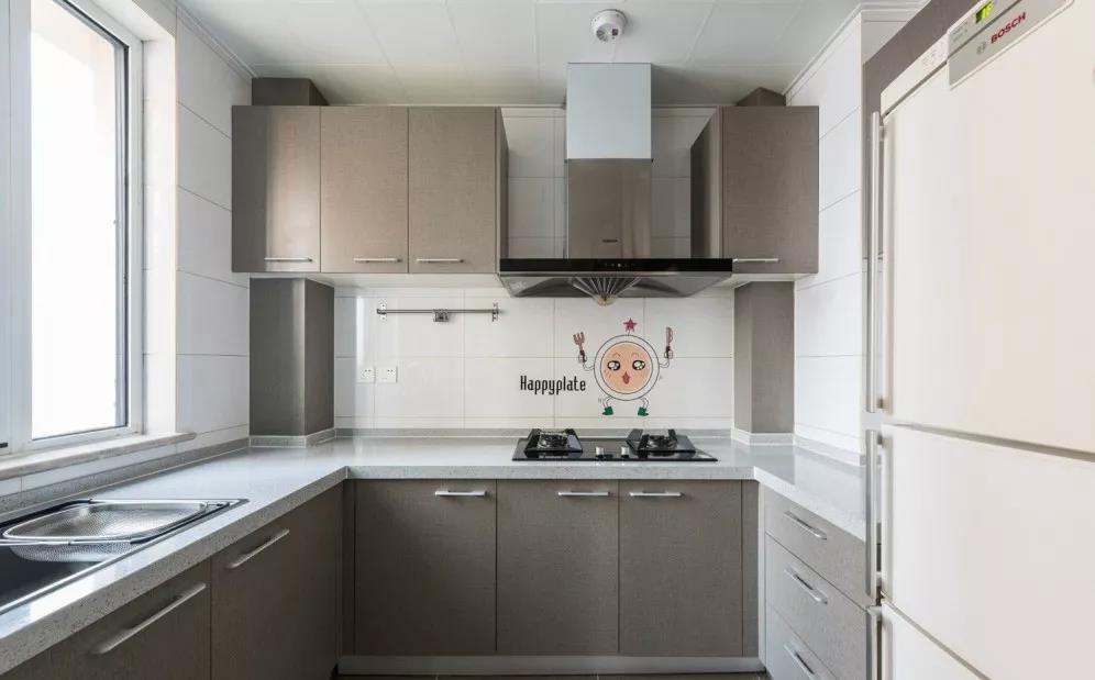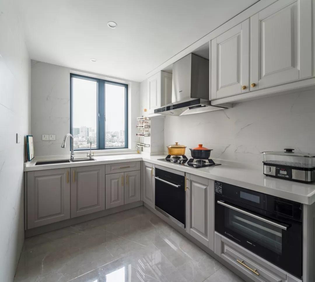 在一字型的基础上多了一个转角,就形成了L型的布局。把水槽和灶台放在两端,中间留空的地方作为操作台,平时洗菜-切菜-炒菜的动线布局也非常的合理。