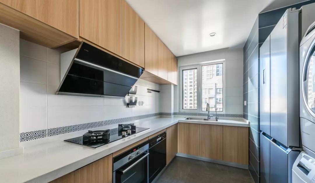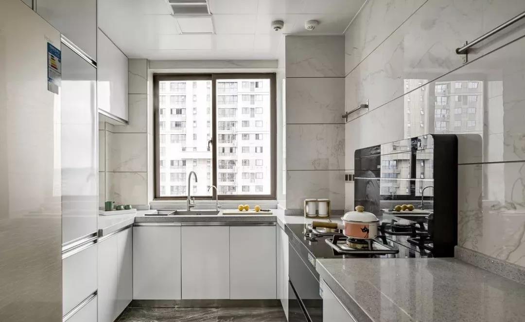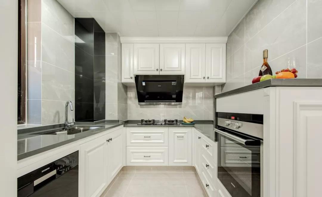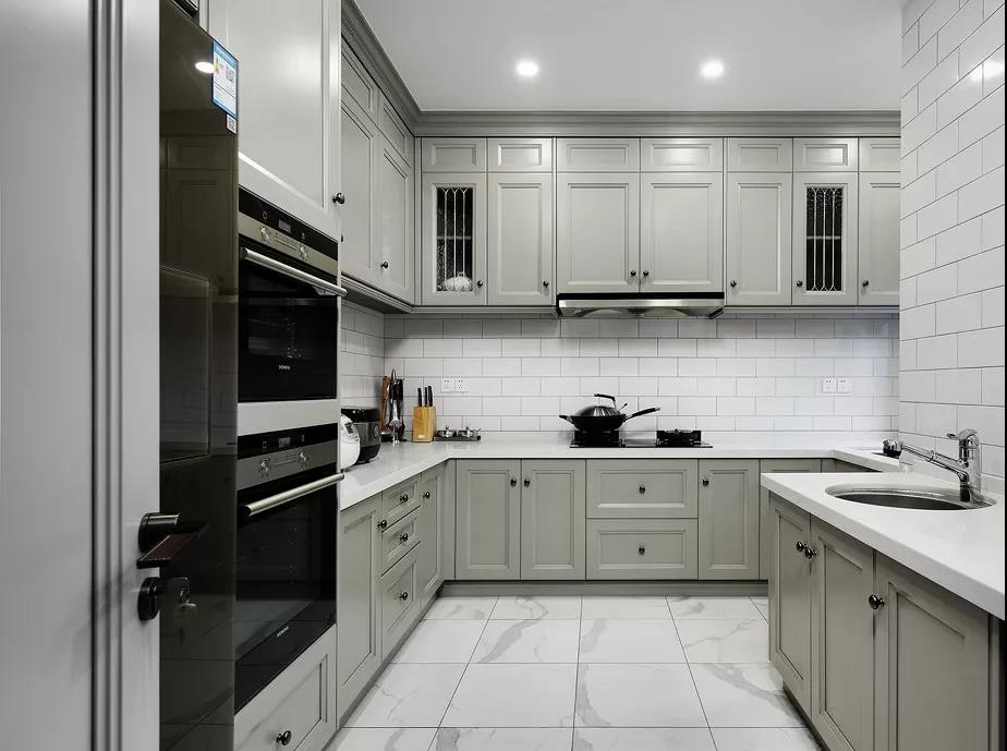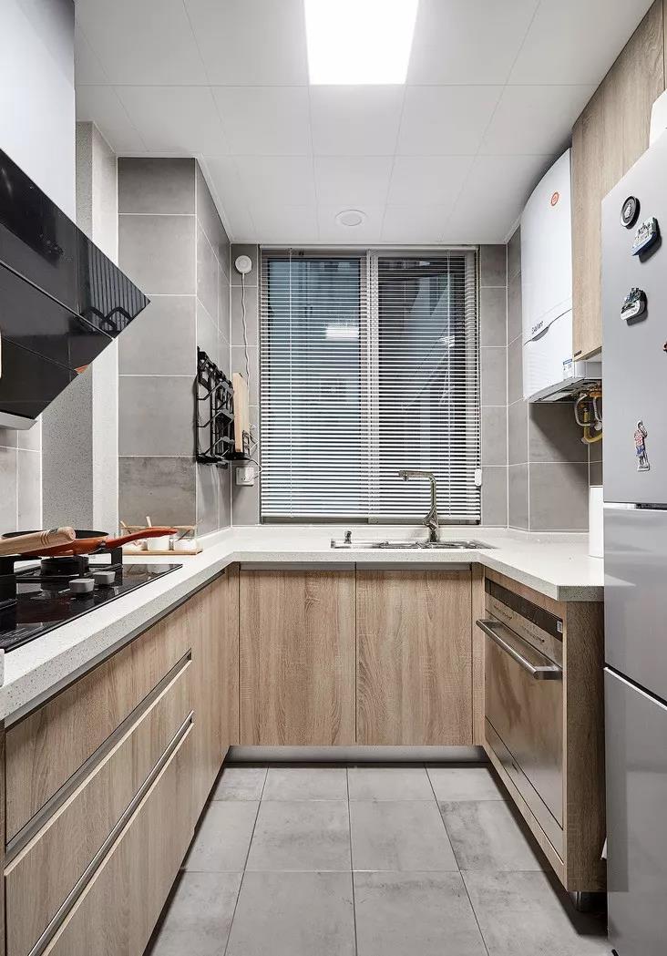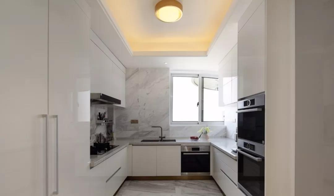 如果你家厨房户型方正,就很适合U型布局。U型布局储物功能强大,水槽设置在U型中间,符合人体工程学,在做饭的时候炒菜、切菜及常见工具都可以放在左右两侧,非常方便。