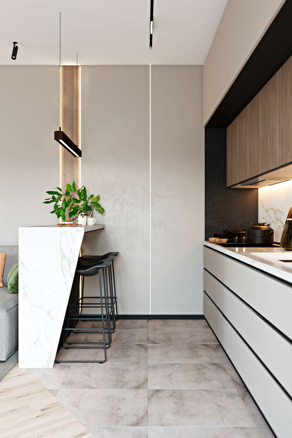 沙发背景墙从客厅延展至厨房,采用当下流行的窄框线设计,让整面墙充满艺术和格调。一个小小的吧台,充当了客厅和厨房的隔断,非常有情调。开放式的厨房设计,扩大了客厅空间,扩充了室内光线。与现代美学的实用性原则完美契合。