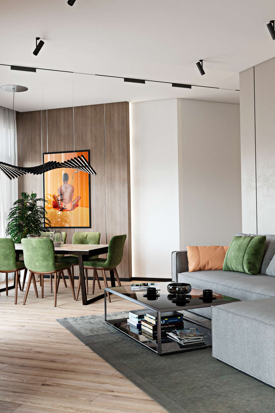 餐厅位于客厅一角,原木和复古绿的餐桌椅组合,富含生机,静静地雕琢着一日三餐的悠闲时光。