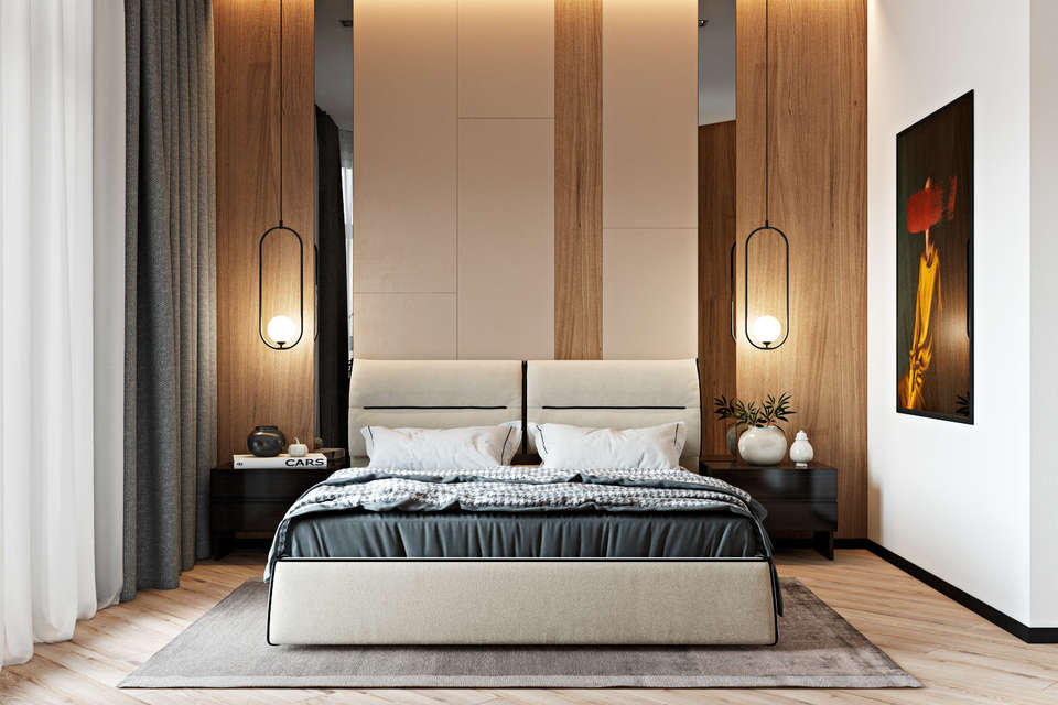黑白原木的高级配色,精致的床头柜,吊灯等装饰,让整个空间别具一格,充满了无以言表的魅力。
