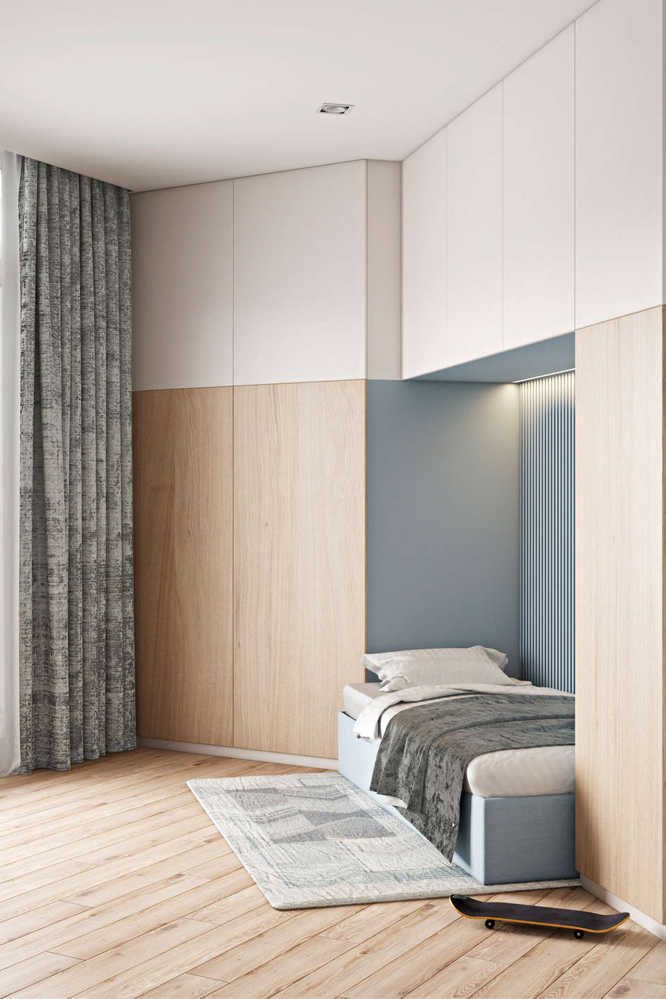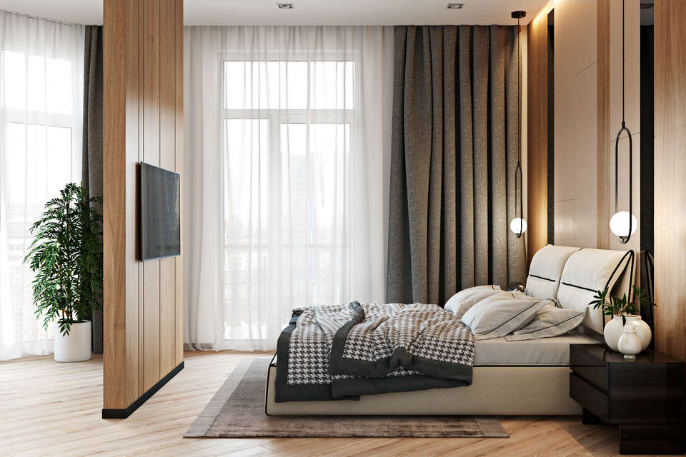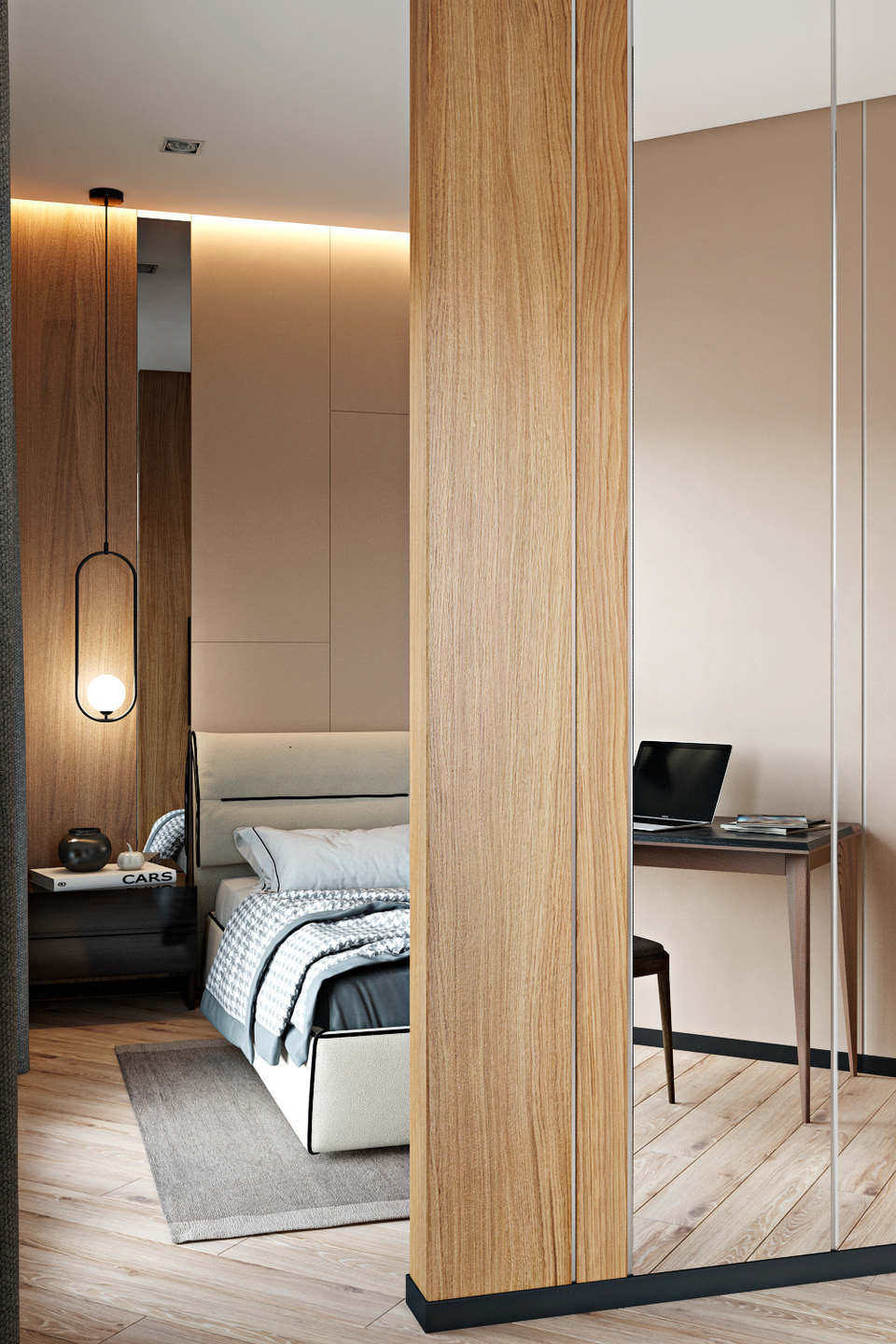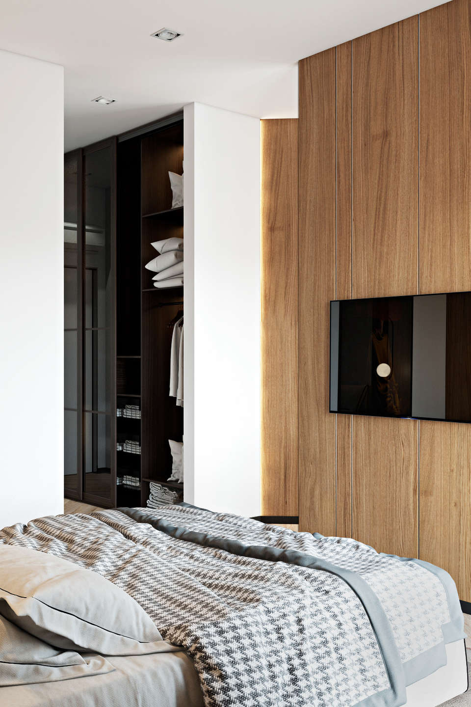 卧室也装了电视,可以让睡前时光更加放松。为了保证视线,安装了一面木质墙板作为电视背景墙。