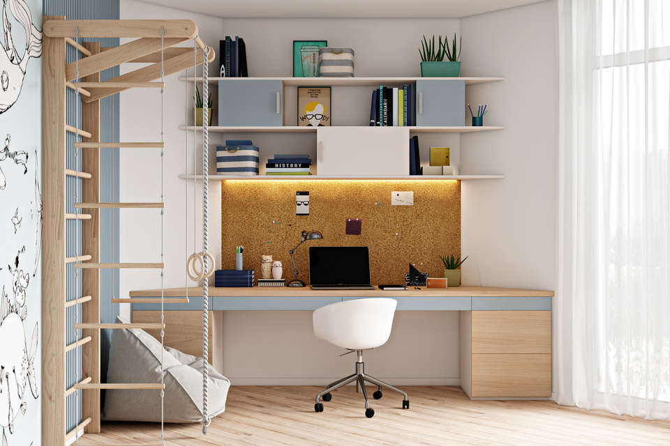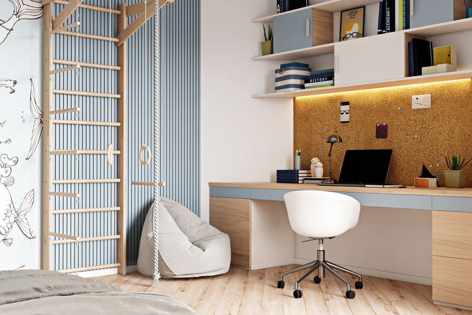 儿童房柜子采用了当下流行的留空一格的设计,更具美感。连小朋友的书桌也是高端木质和魔幻城堡的组合。这样的书桌,让小朋友也更加爱学习了呢。
