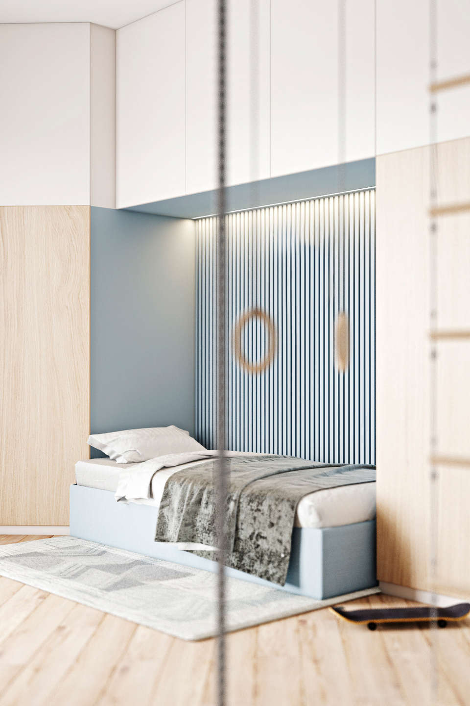 儿童房的设计摒弃了一般的花花绿绿,进而采用白色与淡粉,淡蓝等颜色的组合,既避免了明艳夸张,又不过分暗淡。魔幻城堡的设计,云朵,星星的元素的点缀,让整个房间充满童趣。