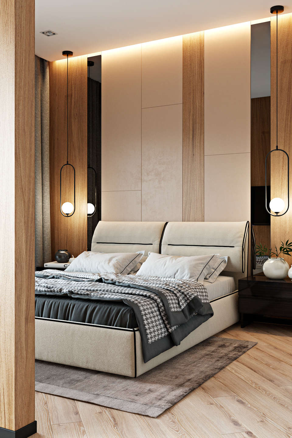 木质床头背景墙,布艺床的使用,给人满满的厚重感。卧室摒弃了大吊灯的繁琐,天花板点灯和床头灯用来采光足够。