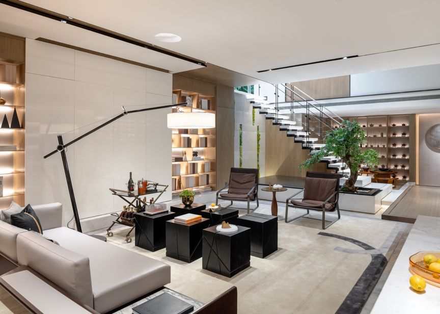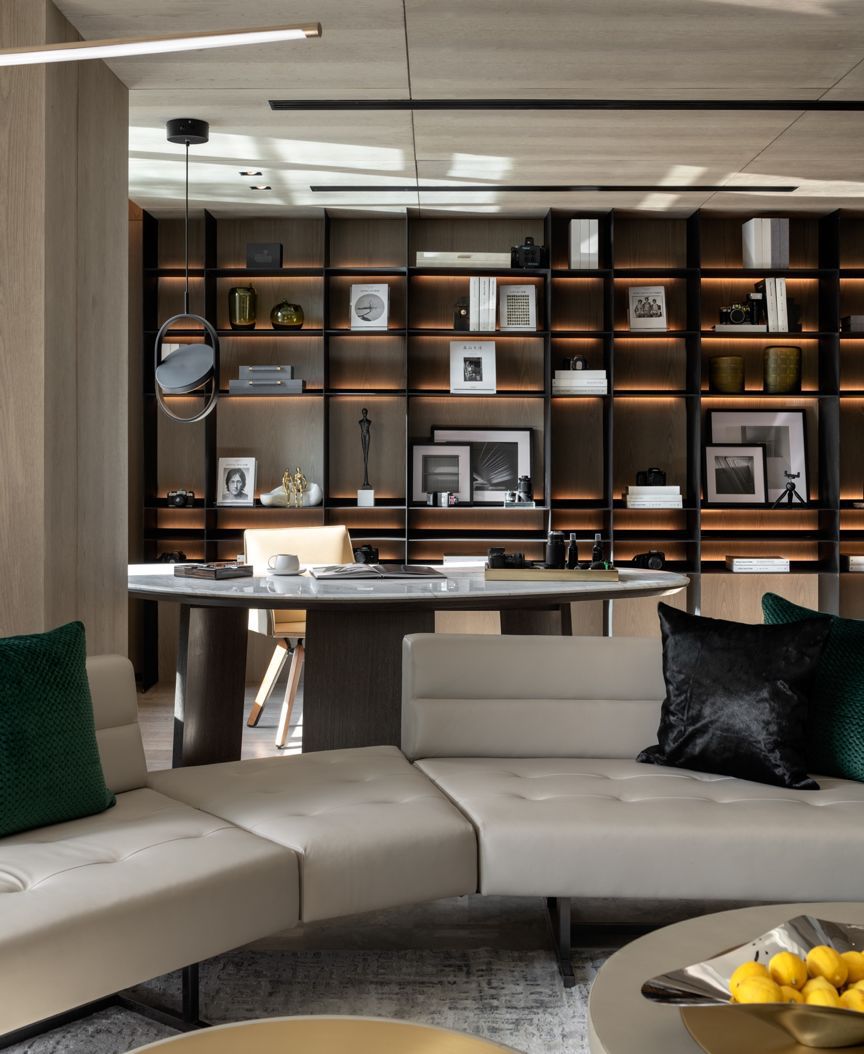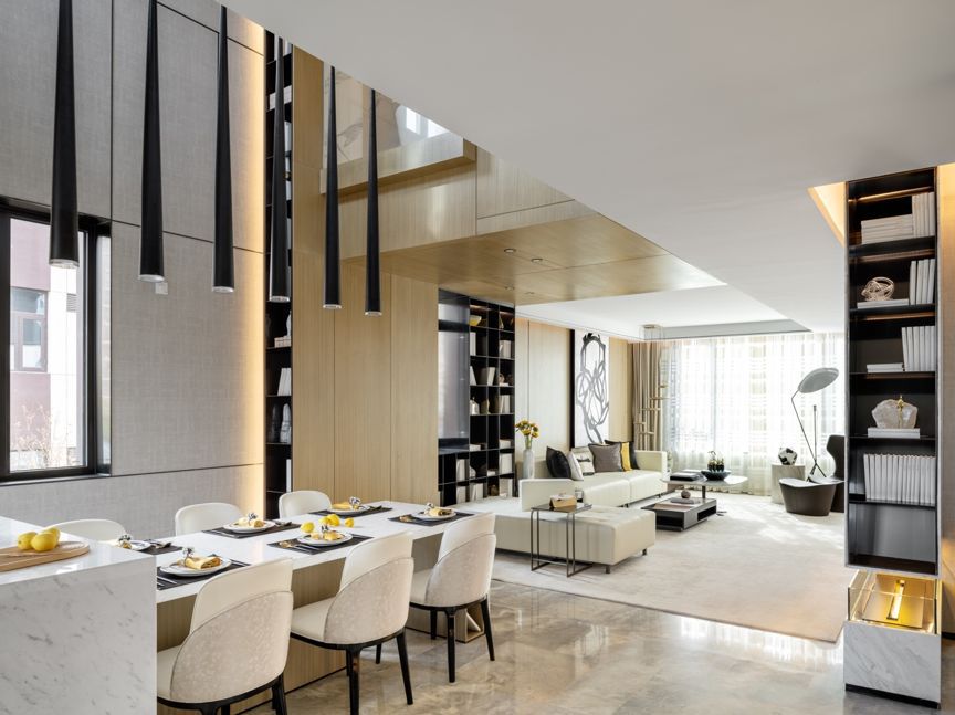 首层客厅,开场自由的空间架构,使得客厅、书房及餐厅在出入玄关的一刻便被一眼望尽,如同置身自然般,极大增加了交流的自由度。