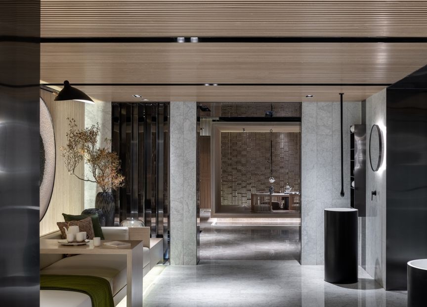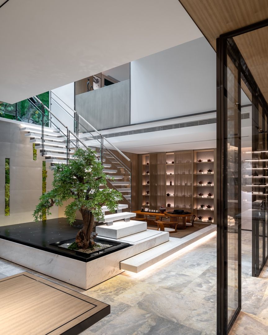 一方隽永的绿意自地下一层起勃勃生长,轻轻摇曳,而后纵穿三个楼层,又与不同的光影搭配,不疾不徐地勾勒出空间的暖意,茶室和SPA区都在这里。