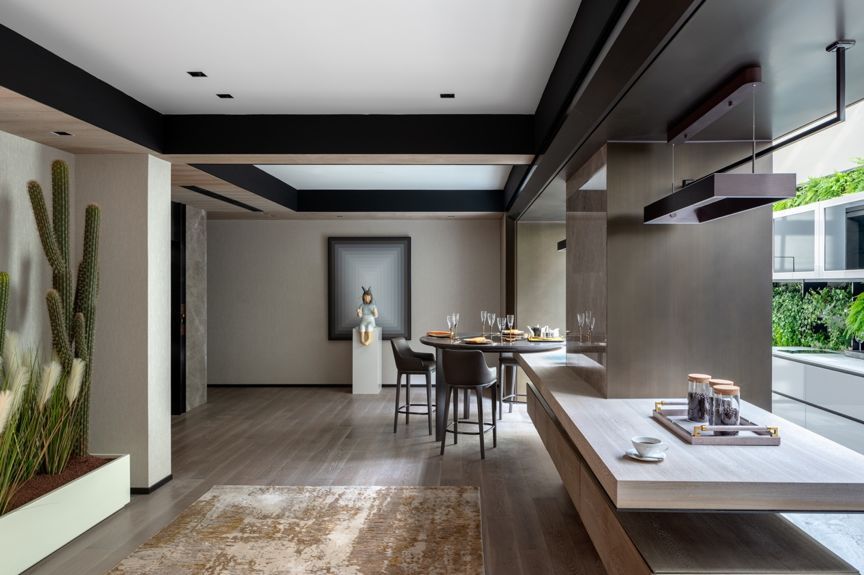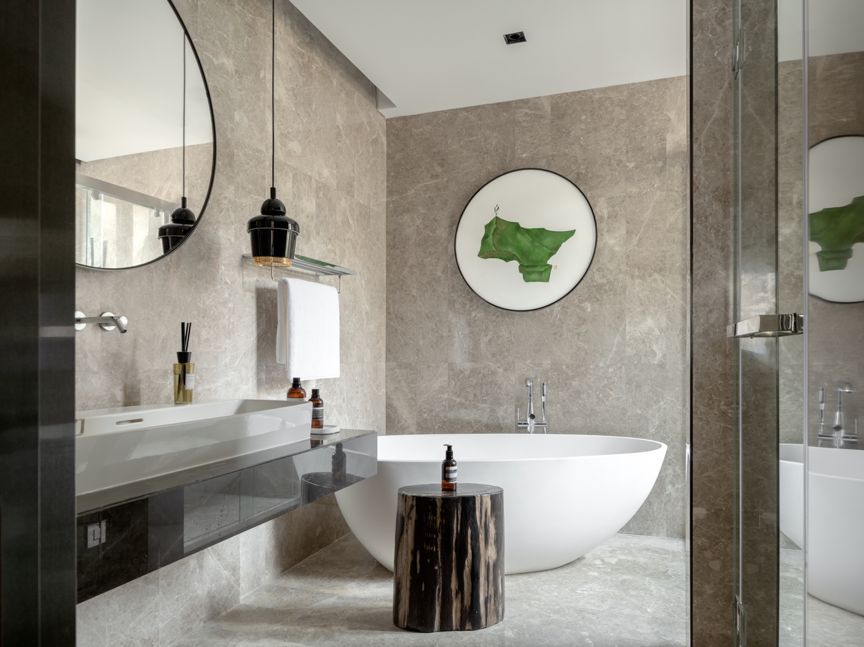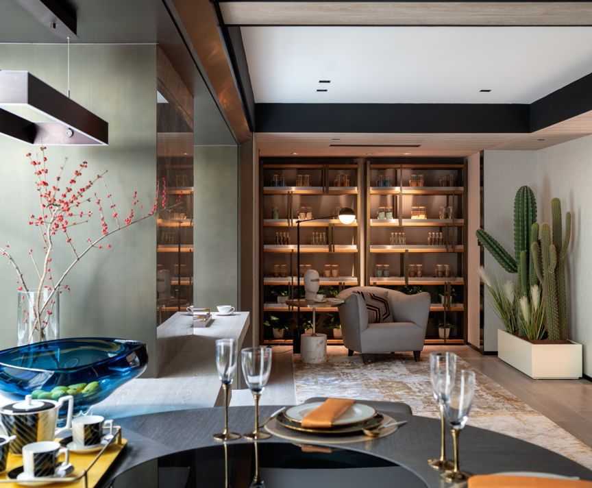 “绿色平和豁达,银河白则昭示着纯净与博大。”他们共同作用传达出生态城市的姿态,亲近生活又高于生活。软装也以环保生态为主,尊重自然环境本真的馈赠,将森林绿巧妙引入空间,从色彩家具到材质艺术品都旨在营造一处可呼吸的绿色花园。
