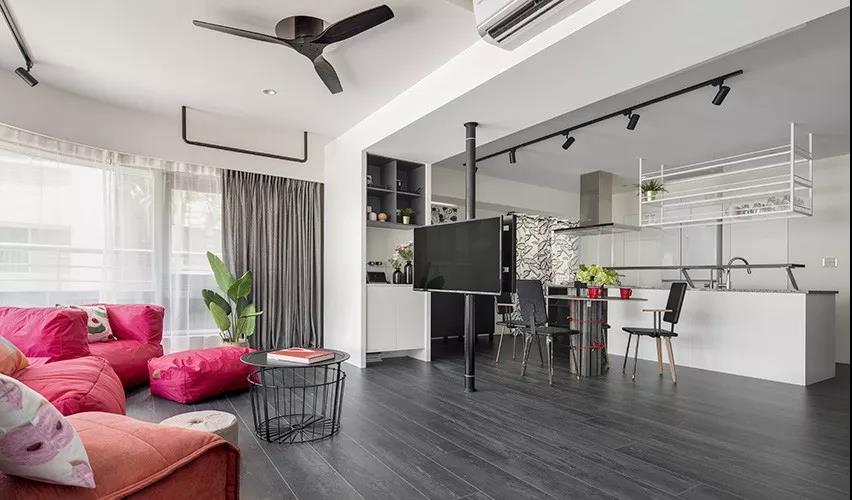 设计师巧用黑框隔断打破墙面单调感,同时使得厨房与客厅互动更方便,空间瞬间灵动了许多。
