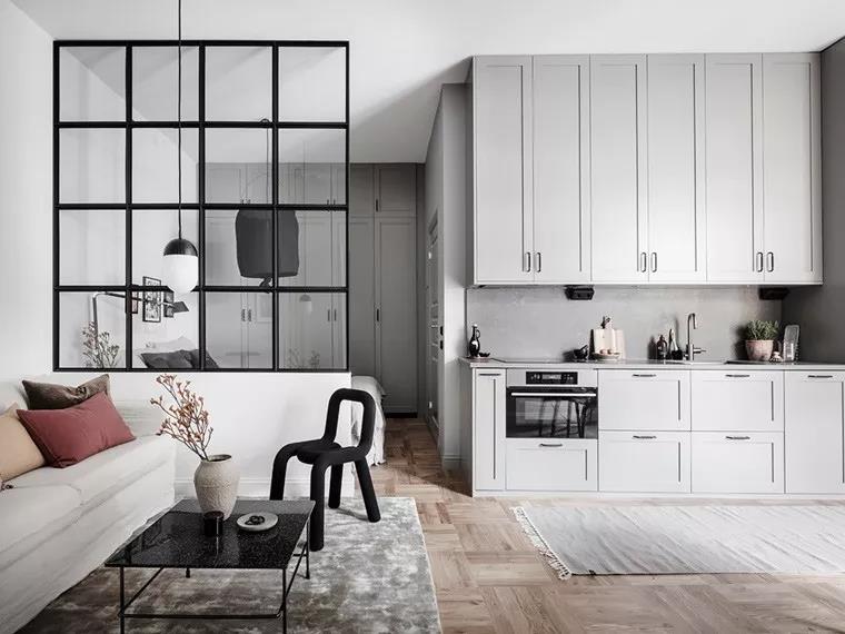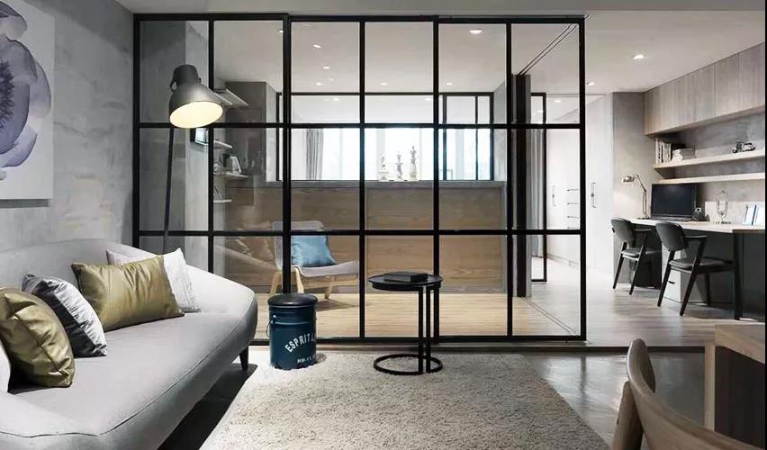 黑框玻璃门,两个显著优点:颜值高,自成视觉焦点;隔而不断,容易营造空间的通透感,顺便改善采光
