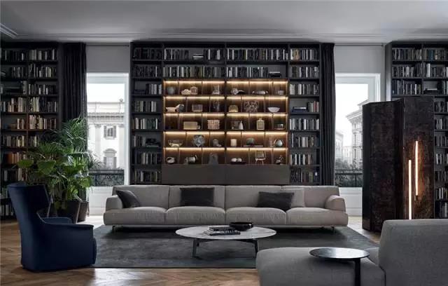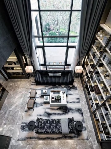 书柜墙周边设计也要够尺度够气派,长体量的电视柜、顶天立地的门和窗,无不彰显着客厅的大气豪迈!