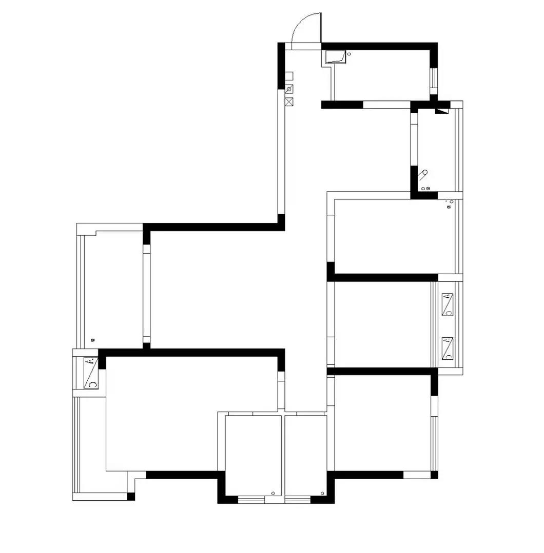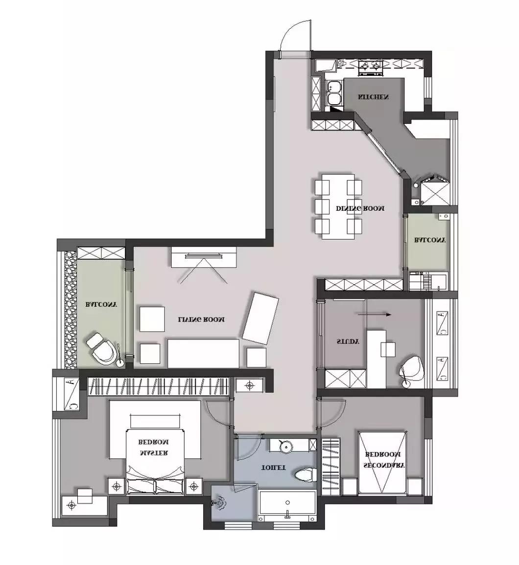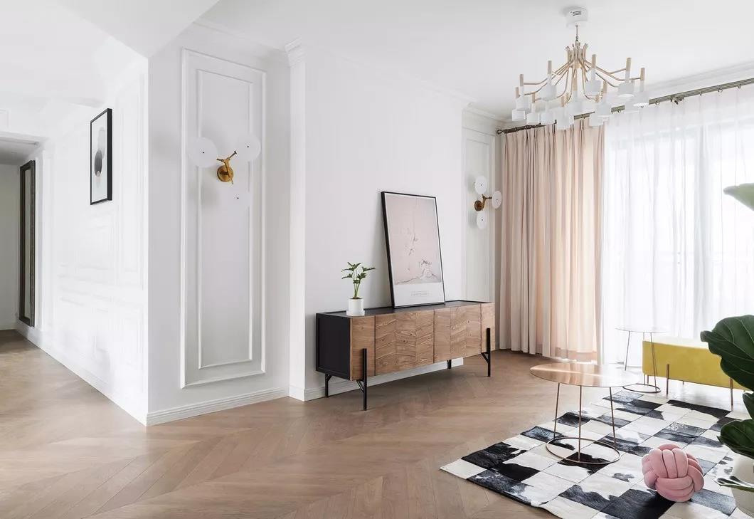 狭窄的过道经过改造设计,过道前段跟餐厅连接在一起,成为餐厅空间的一部分;过道中段的设置,保证客厅拥有两个采光源,成为客厅书房联系的纽带;过道后段位于梳洗室位置。空间与空间相通相融,实现了过道在此空间的消隐,美感度大大提高