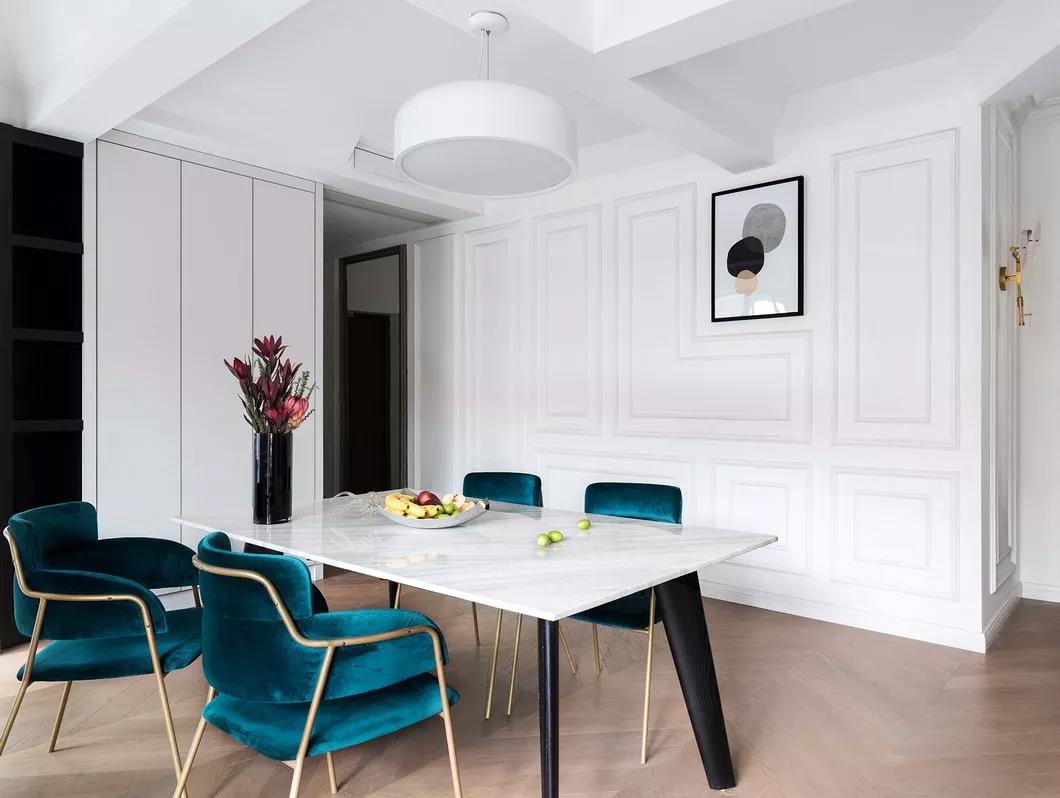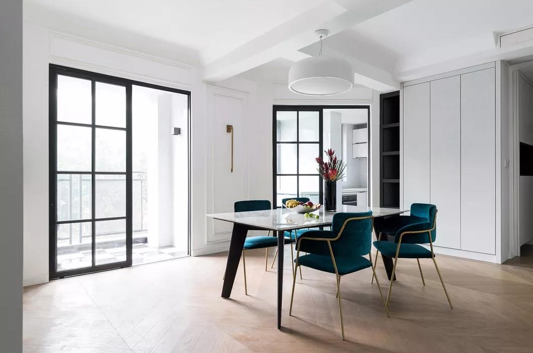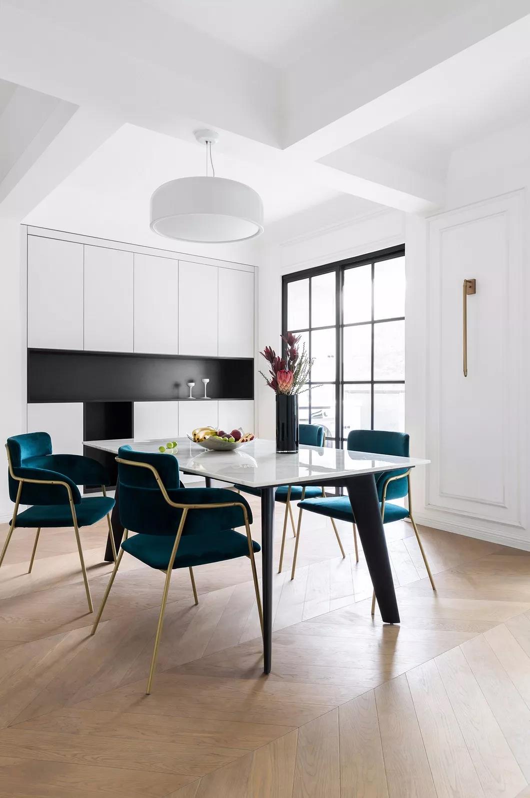 装饰元素少,大量留白,直角线条,美感不需要过多的堆砌与重复,餐桌餐椅简单搭配即是一道风景