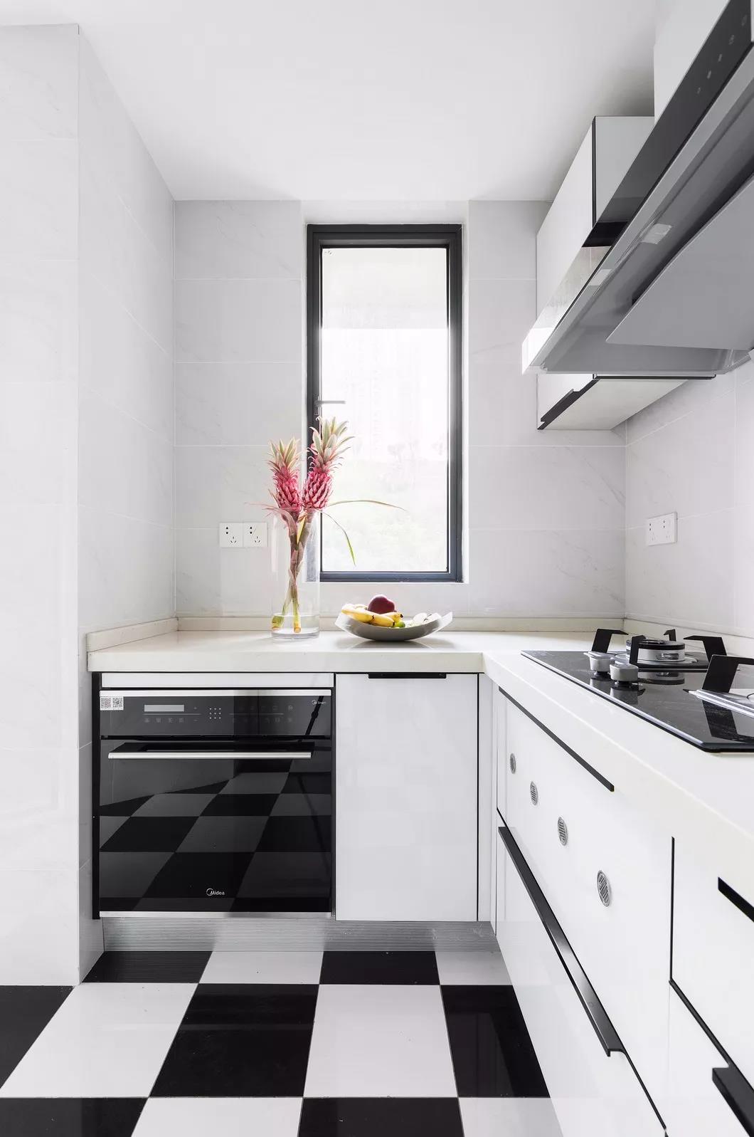造型简单的厨房,经过改造,采光良好,操作台增大,黑白相交的色彩也让空间多了几分时尚元素。玻璃滑门让餐厨空间形成了互通的视觉,强调整体性和变化性。利用流畅的动线安排,将不同的功能空间区分开来,同时保持着空间之间的相互交流,保持着整体空间的一致性