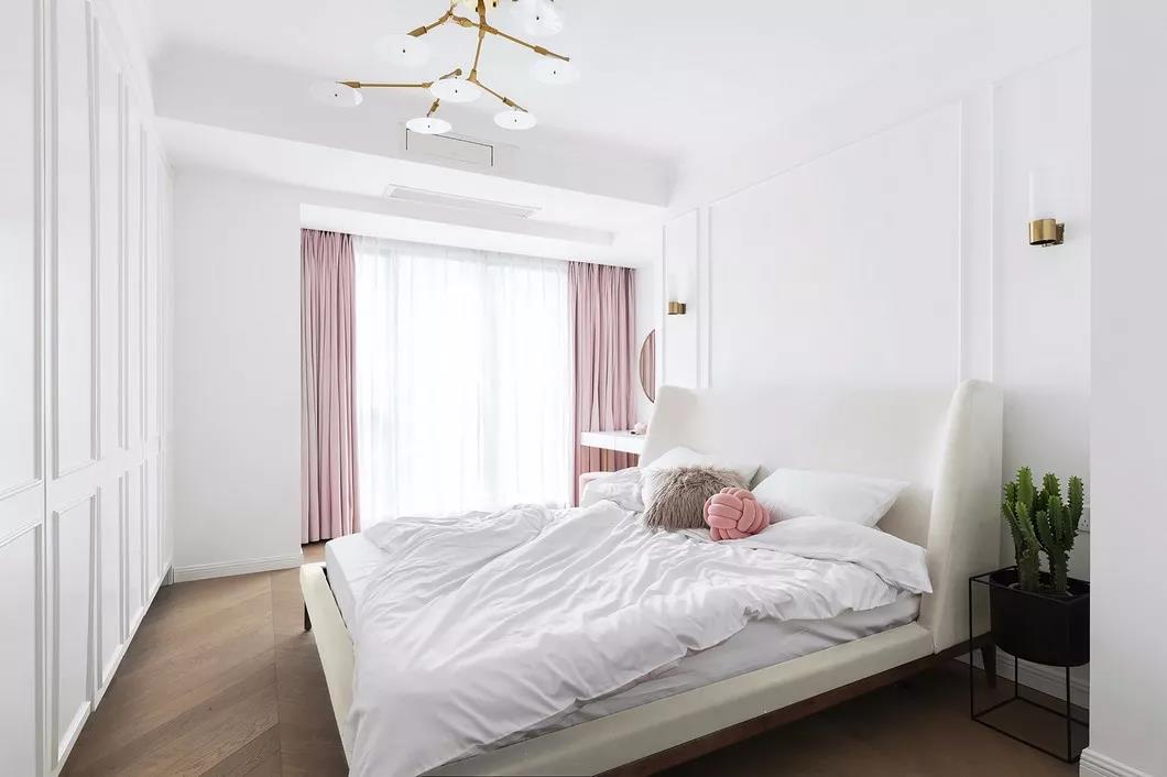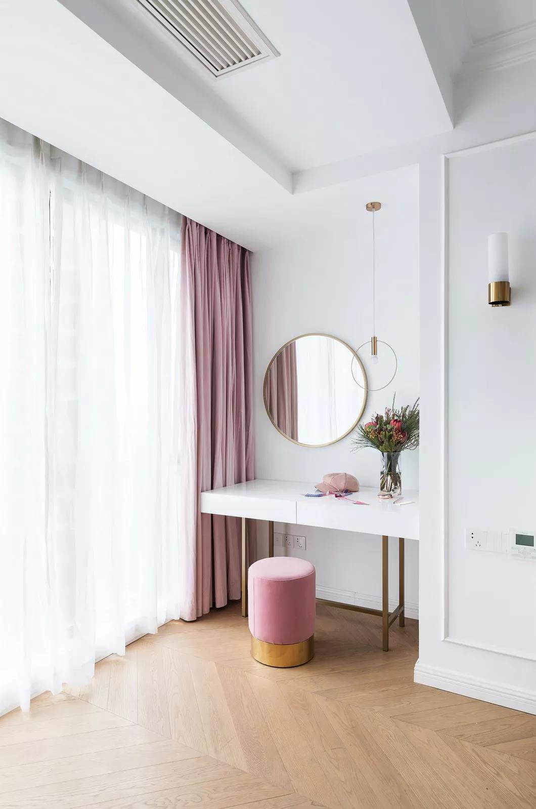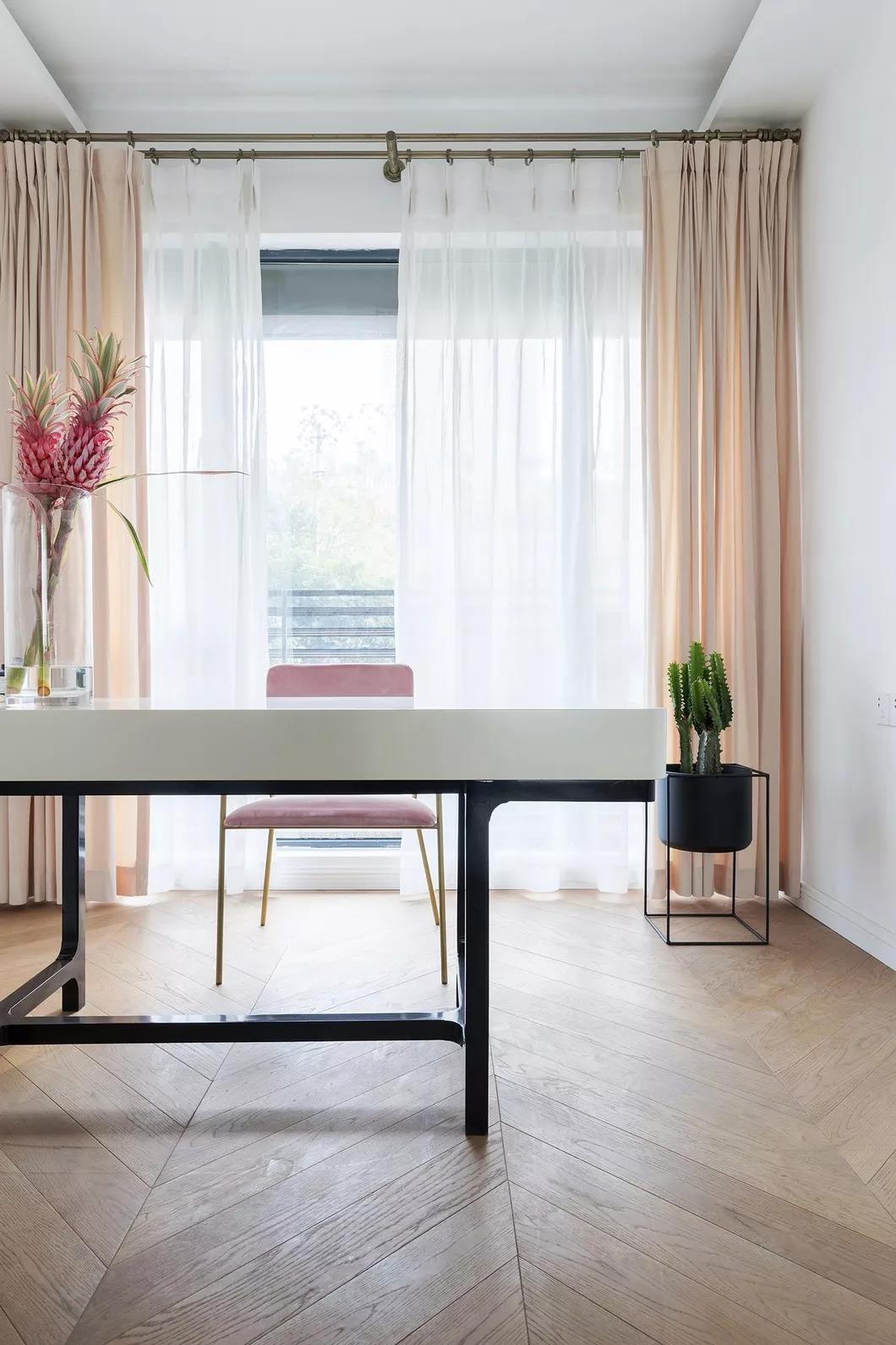 设置大面积的落地窗,弥补了书房采光不足的遗憾。自然白与茱萸粉和谐并存,力求用简单的色彩区别于其他现代风格的厚重感