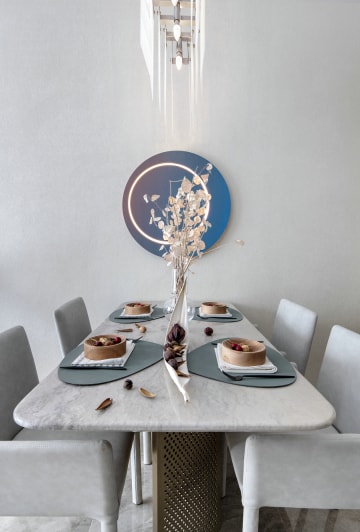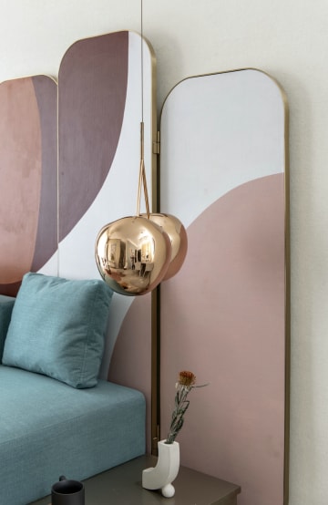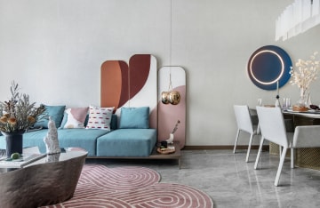 沙发区是整个房子里折衷主义浓度最高的地方。千禧粉、天蓝碰撞,与黄铜吊饰共同发酵时光,演绎出时髦而梦幻的多元层次。