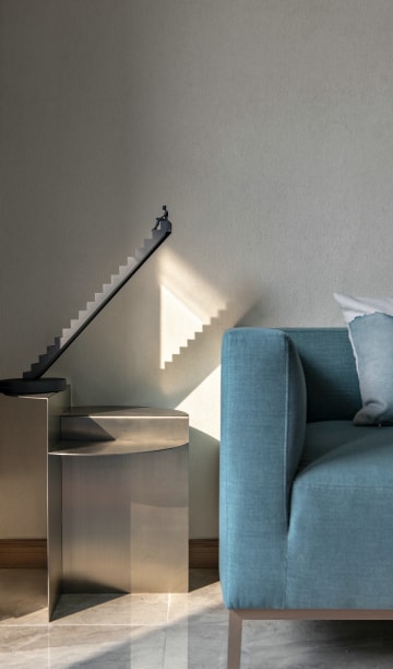 色彩的协调渐变让客厅与餐厅产生对话,在材料质感的对比下,隐喻着一份文艺的腔调,客人的视线不停游走,小户型的纵深感随之而来。
