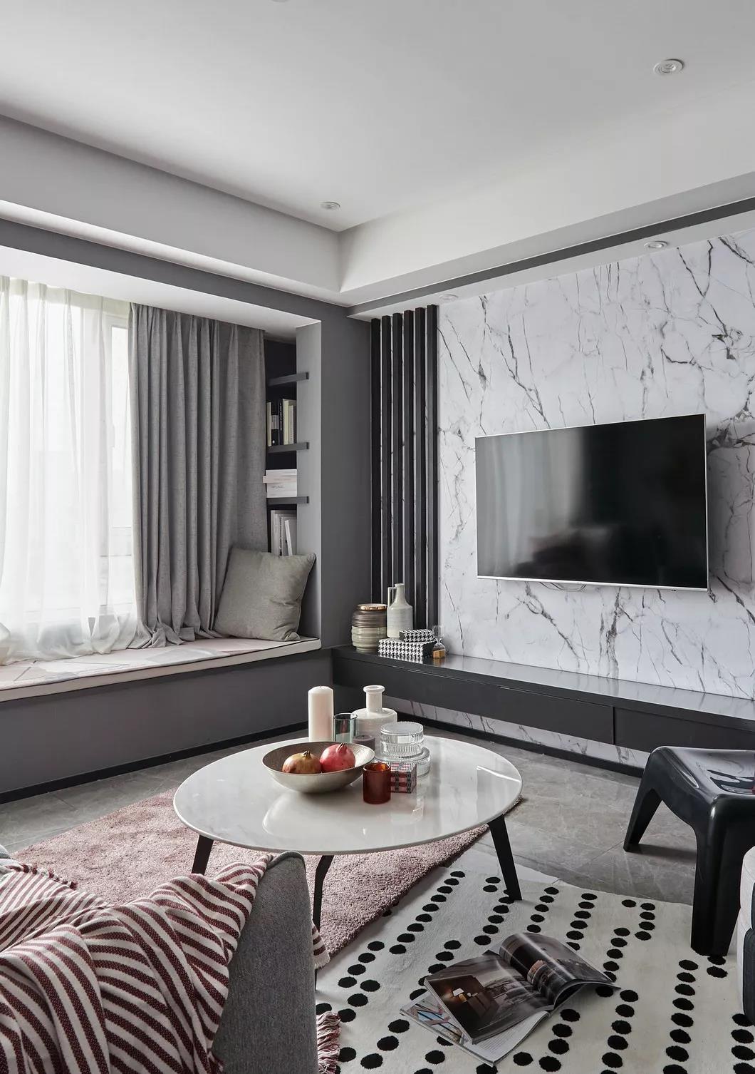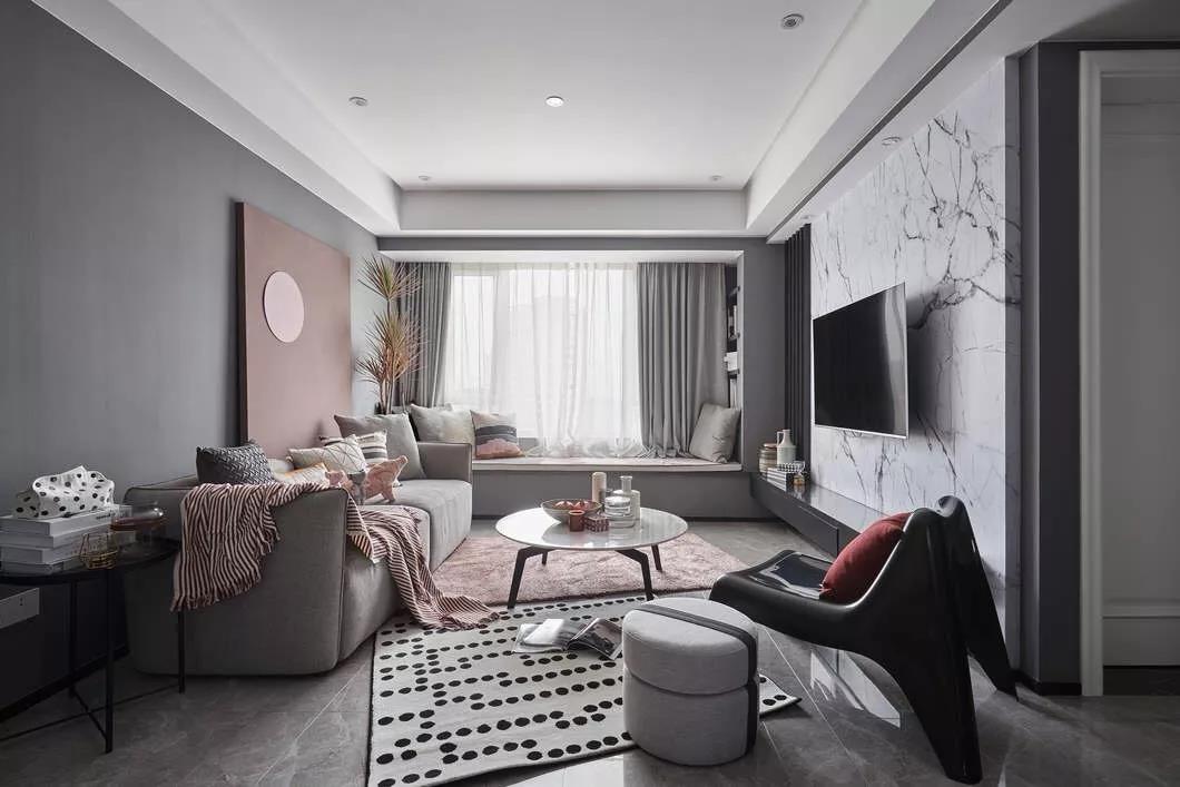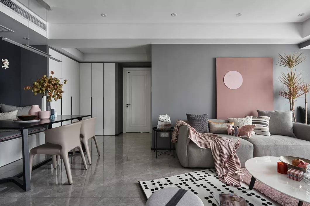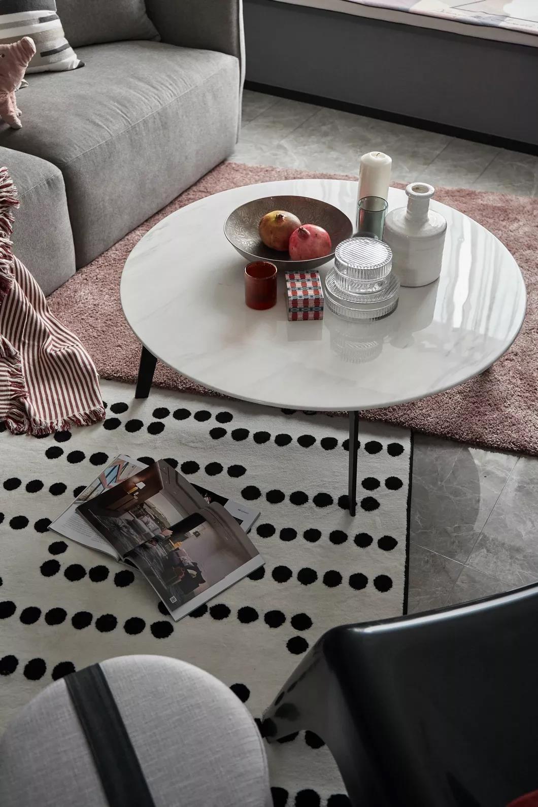 黑波点地毯和烟粉色地毯交叠,使本来平淡的灰色调客厅瞬间个性十足,颜值爆升。