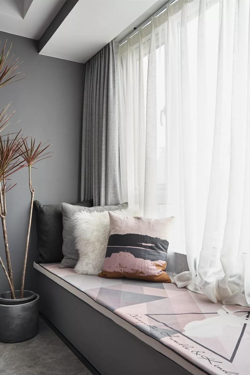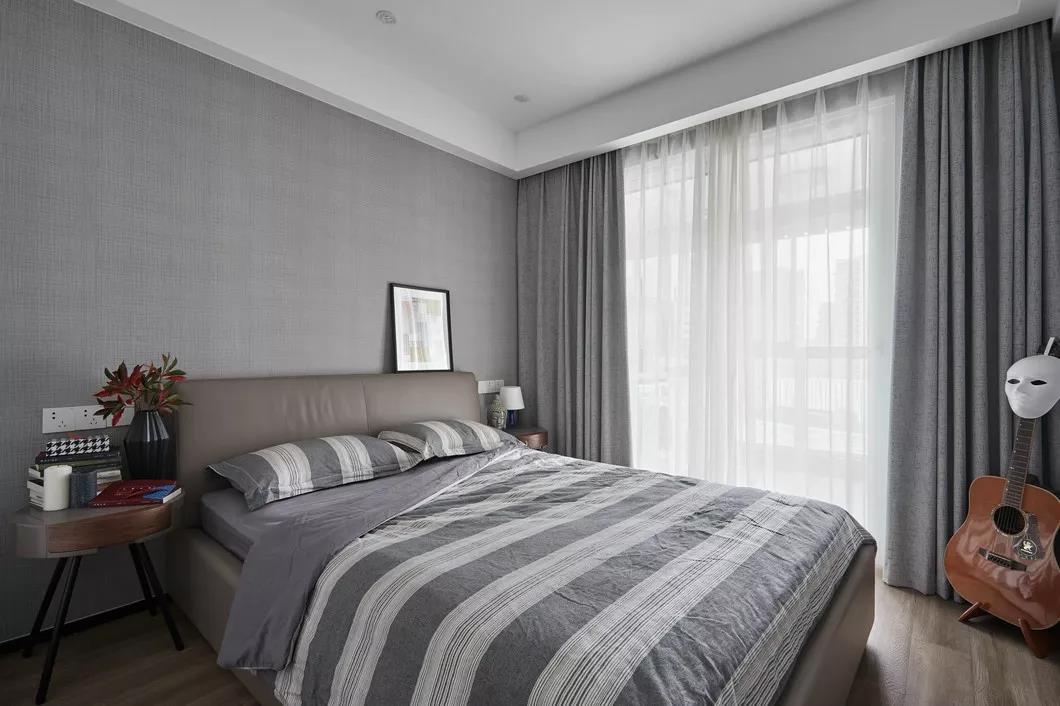 主卧纳入了原阳台作为衣帽间,一整面的落地玻璃窗带来了极好的视野和采光,让主卧的空间配比宽敞而明亮。