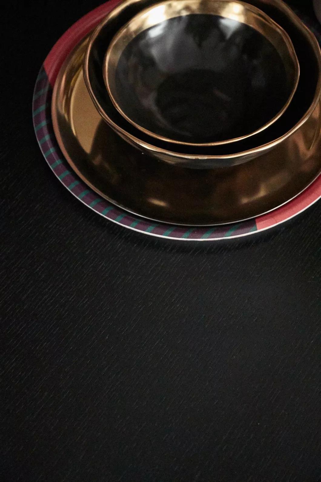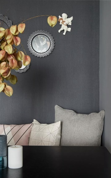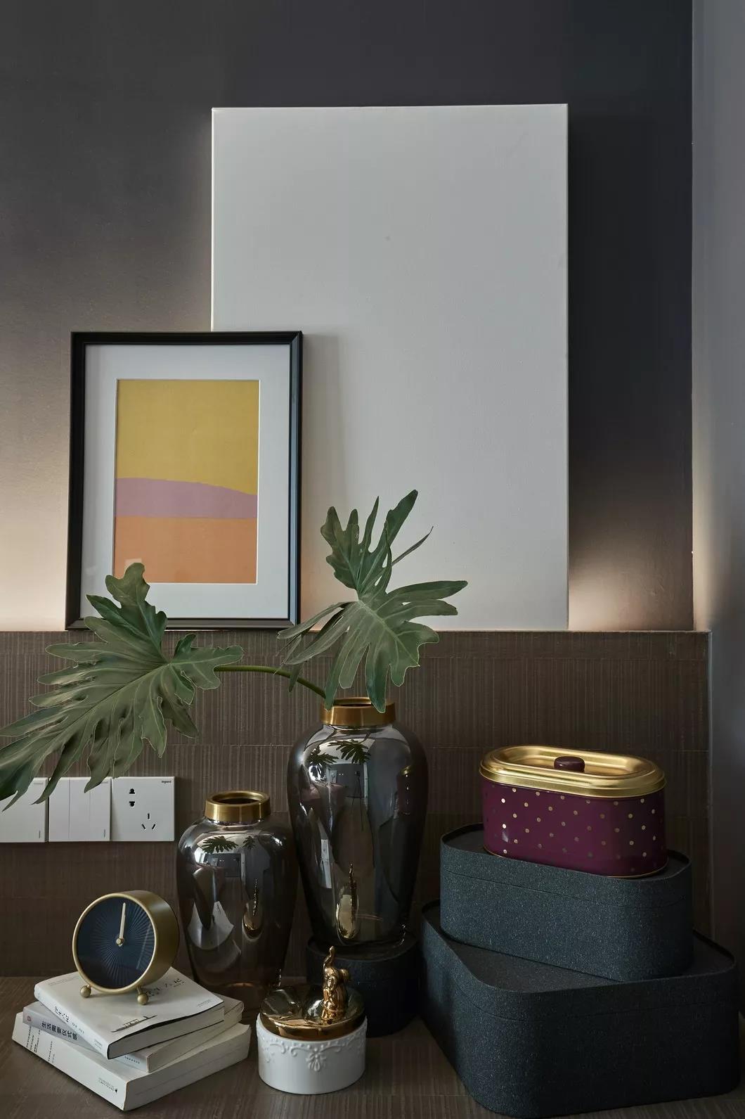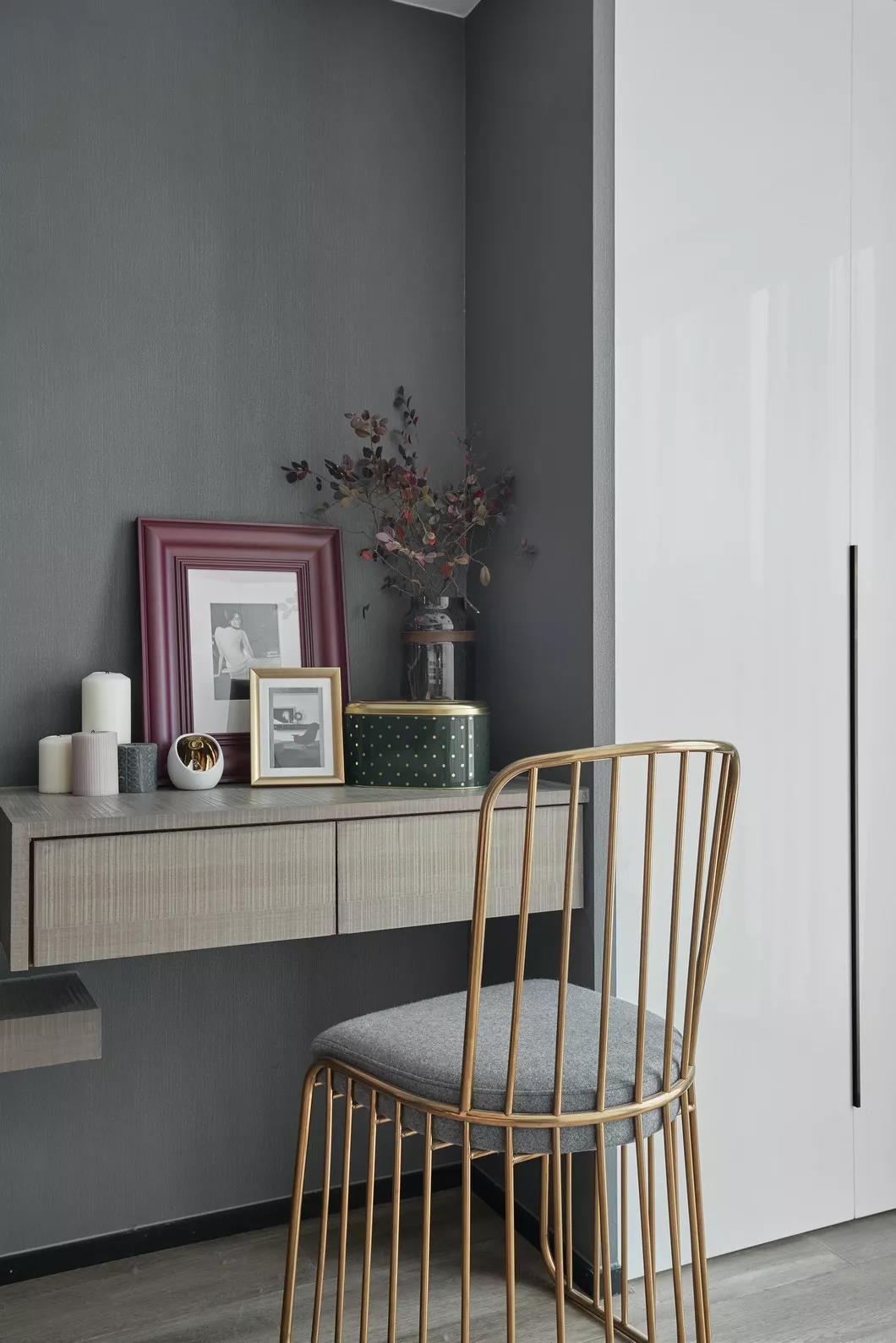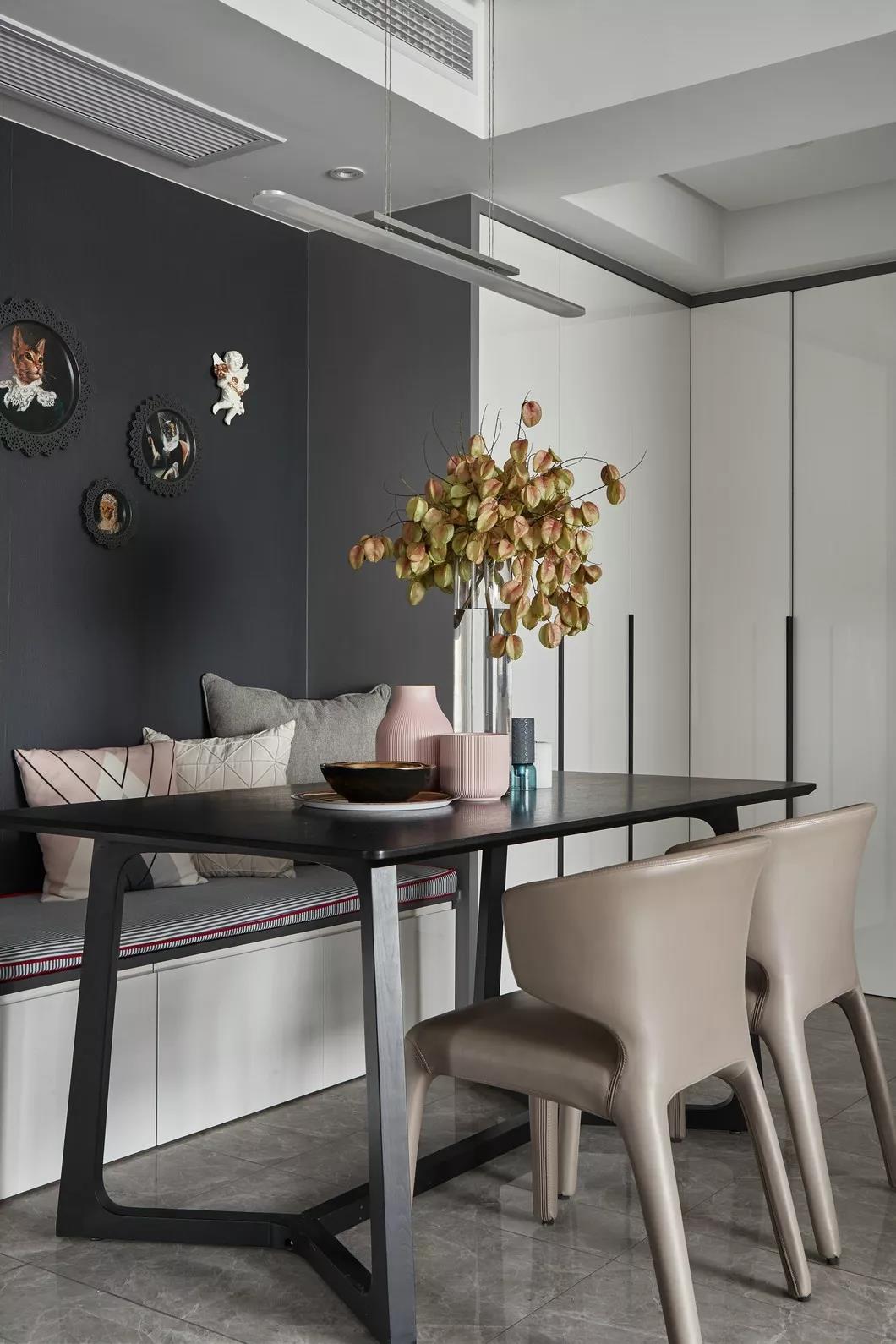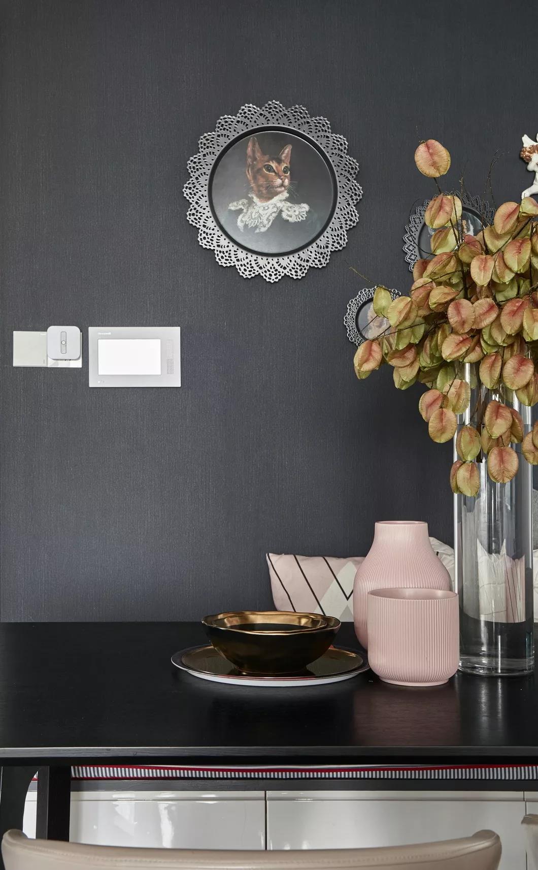 墙面同色系的复古挂盘打破了深灰色的沉静,飞翔的“天使”歌颂着生活的美满与幸福,这些文字诉不尽的细节都反映着设计师对生活美学的“小心思”。