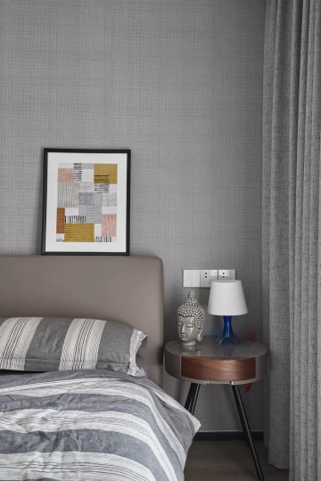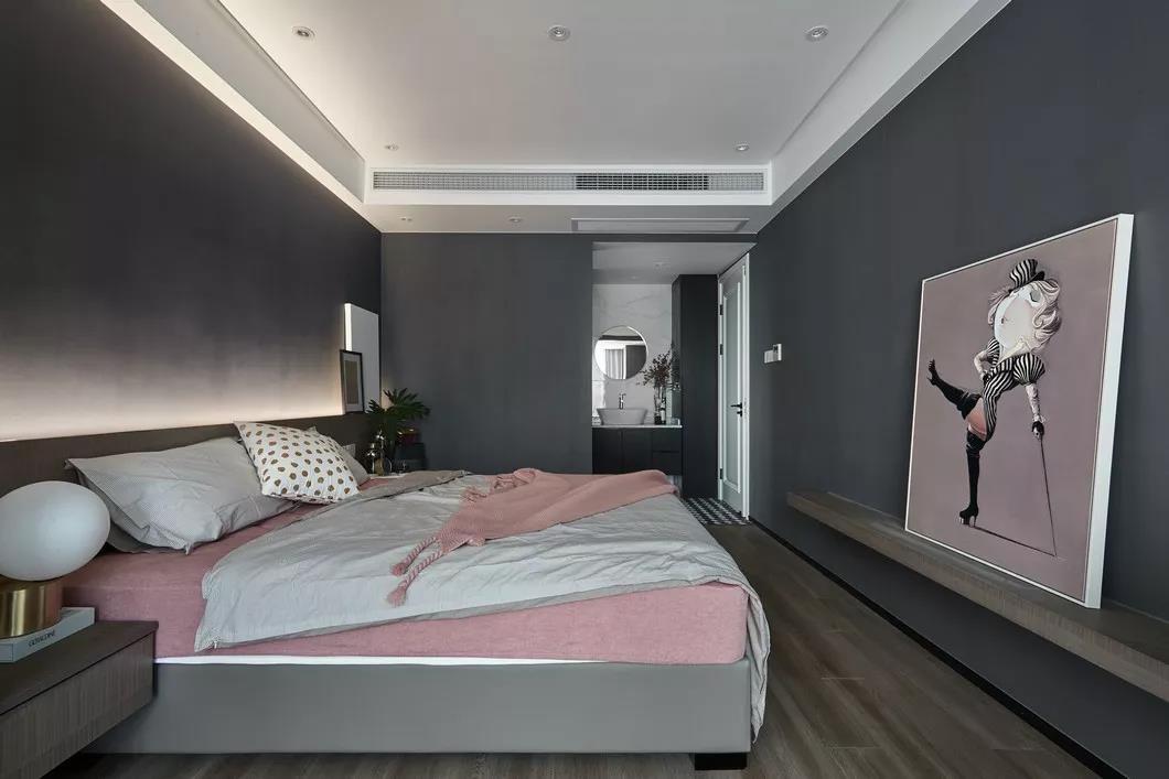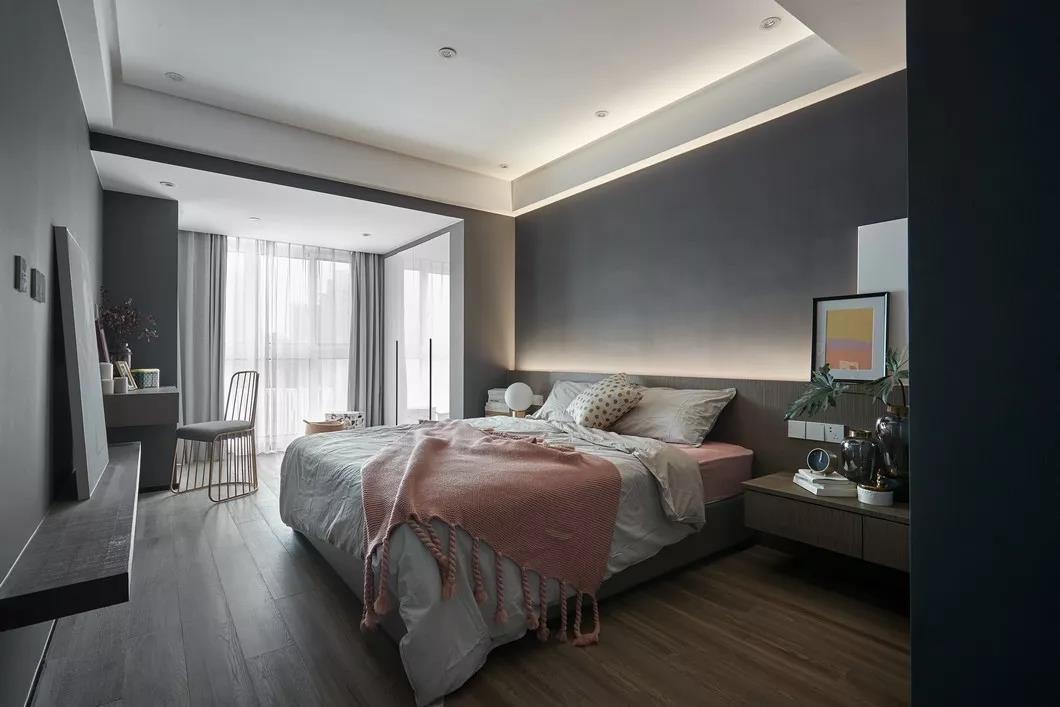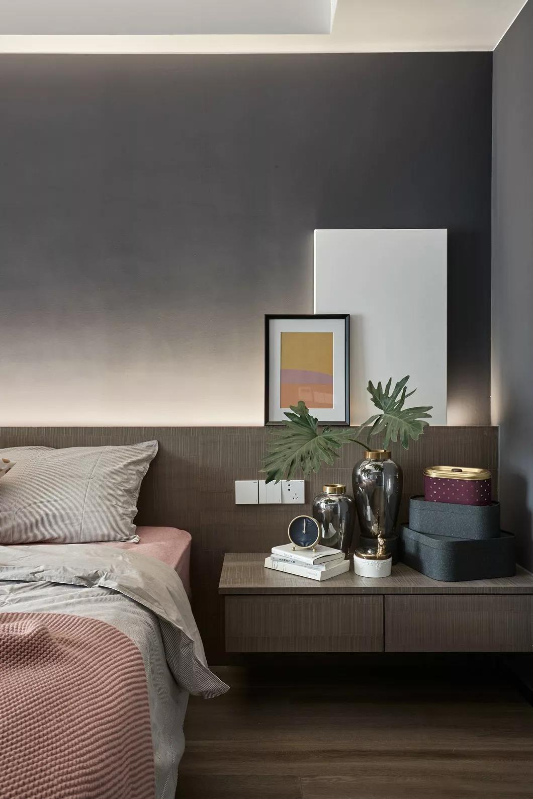 木工现场制作的床头背板与床头柜,贴的是台湾原厂木饰面板,质感独特而精致,线性的洗墙灯带能更好的营造温馨而安宁的舒睡氛围。
