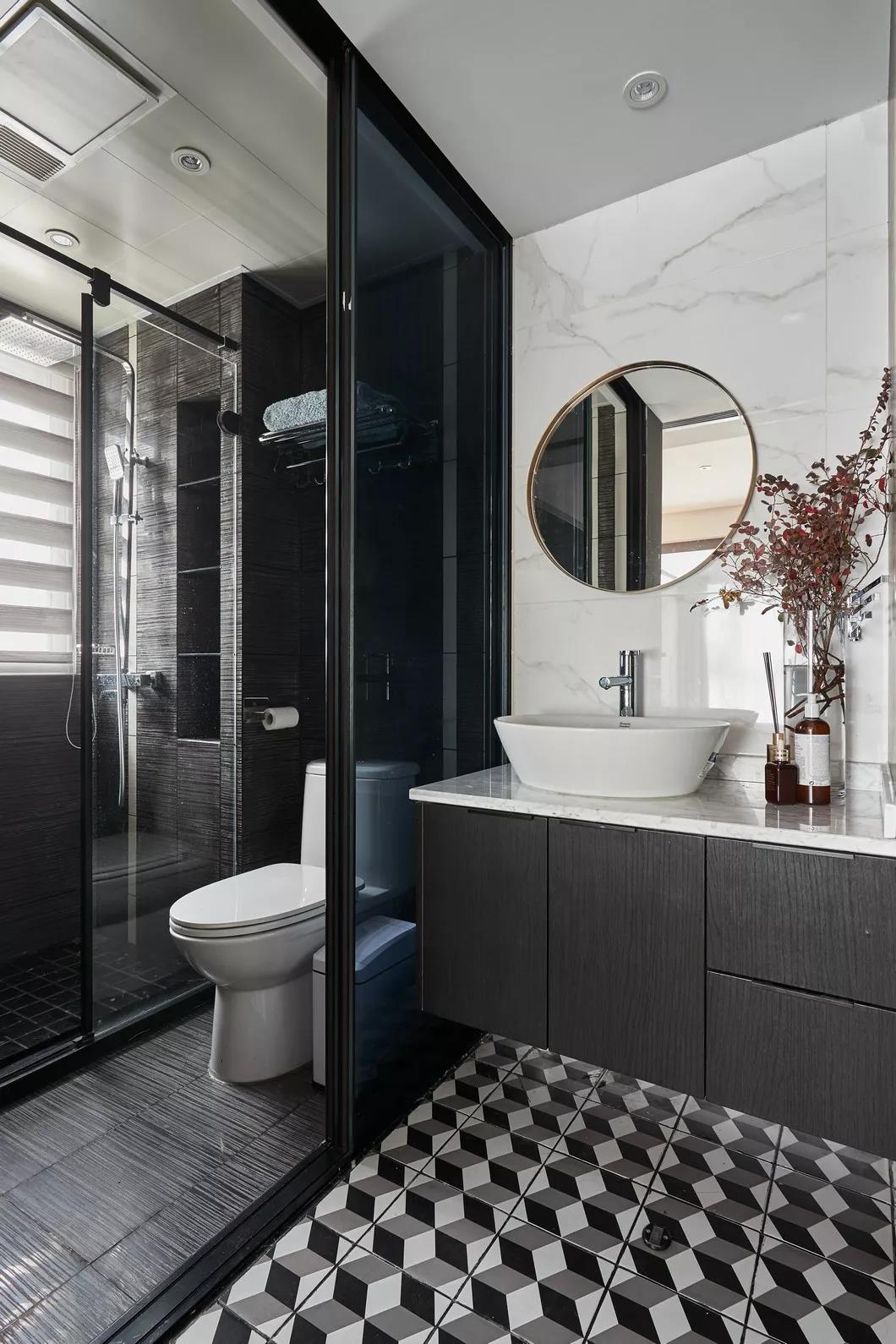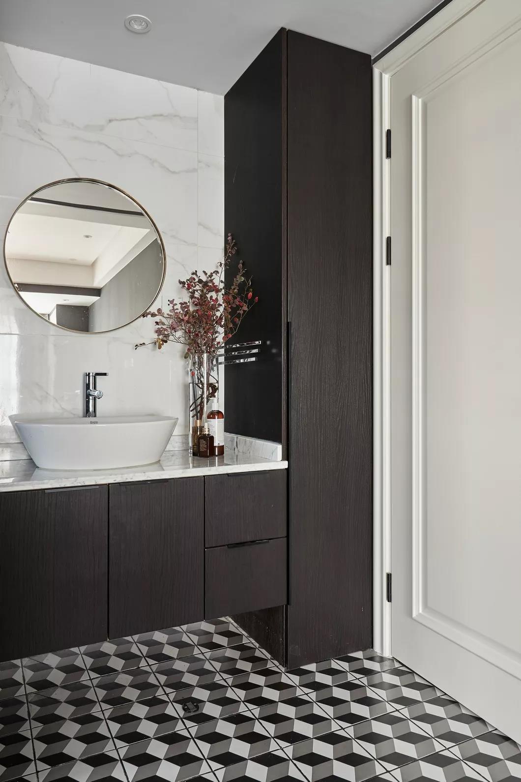 主卫在面积配比上没有很大的可使用空间,设计之初业主就向设计师提出了主卫想要精致而又有强大收纳的诉求,设计师精巧的运用黄铜圆镜来提升空间的精致气质,一整面落地大柜子也很好的解决了化妆品收纳问题