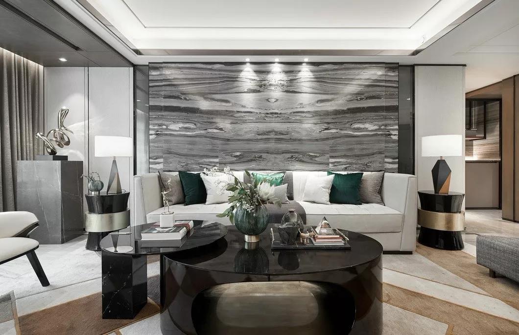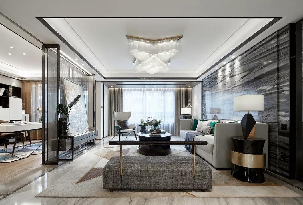 客厅以沉稳的大理石花纹色调为主题,现代风格造型简洁明快,兼具了时尚和潮流,用开放式设计手法去诠释空间氛围,使整个空间舒适而明亮。