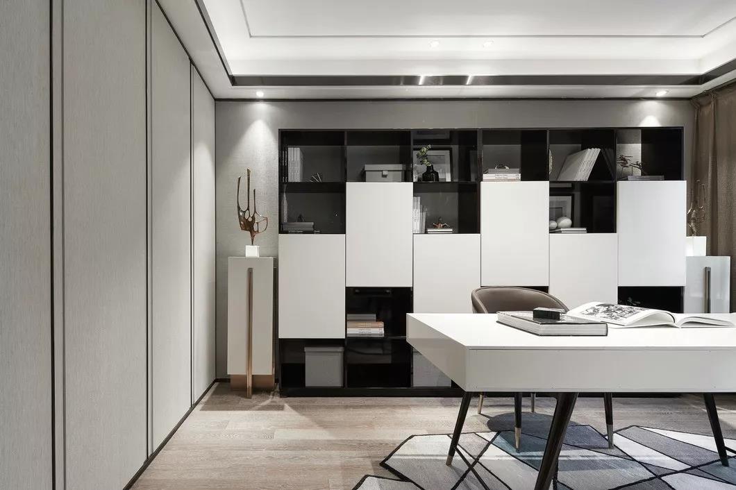 有独特艺术感的雕塑品,体现了主人不凡的品味。干净简洁的书房配以时尚的格纹的地毯,使空间的每个点滴都充斥着都市气息。同时在书房运用内嵌置物的手法,使空间得到了最大化利用,可谓是藏秀并举。