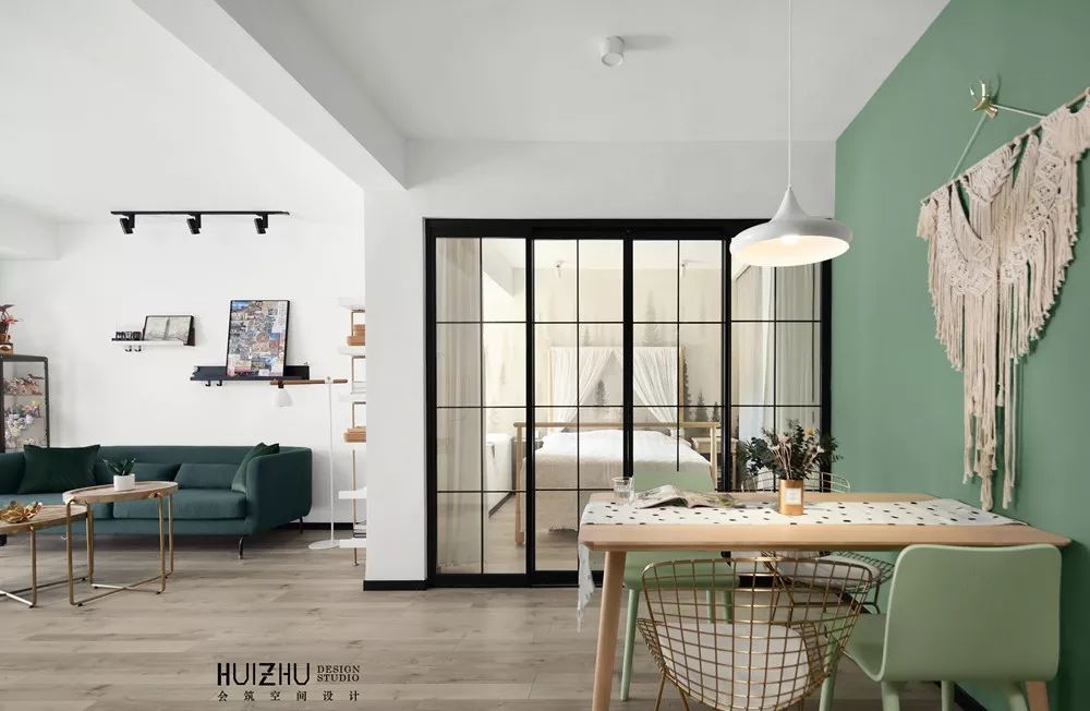 硬派的黑色金属边框的推拉门,与之相对的是棉麻材质的门帘,迷雾森林壁纸,刚柔并济,产生自由和谐的森系美感。