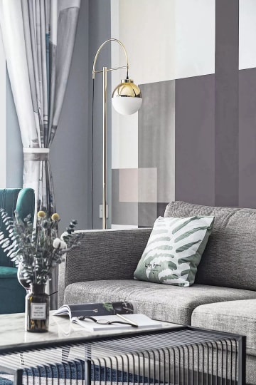 金色的金属支架,白色的灯罩,与灰色的布艺沙发从色彩上互相映衬。