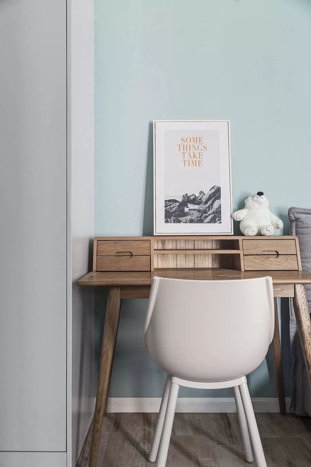 书桌将木材的肌理真实地暴露在眼前,深刻地展示了最纯粹的材质之美。这也体现了北欧风崇尚自然的理念。