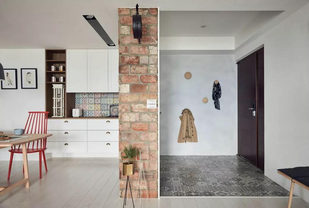 斑驳红砖墙横亘在玄关与餐厅之 间,以老砖展现60年代的人文温度,再加上一盏仿古壁挂式时钟,仿佛走进欧洲街头咖啡馆,除了界定范围,同时也是餐饮时光的温暖端景墙。
