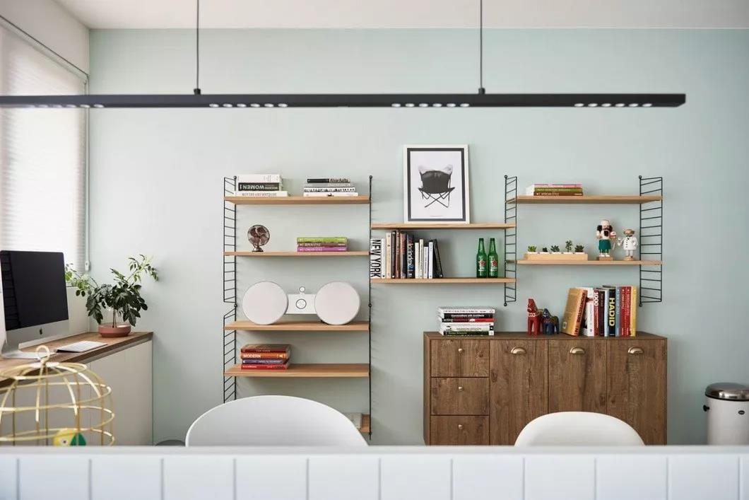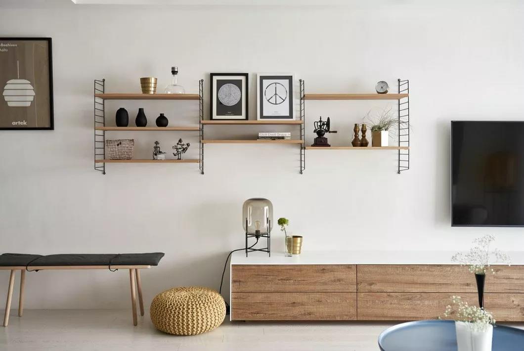客厅电视墙延续纯白色的洁净特质,展示柜融合温润木质与轻盈框架,构画清爽舒适的居家氛围,而沙发后方则利用一道矮墙与书房稍作区隔,保留开阔视野,让两个领域相互融贯,成为彼此美好的生活风景。
