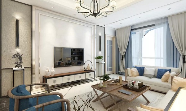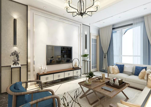 此项目整体风格为新中式。电视背景墙采用了大理石配以回字造型金属线条,两侧墙布搭配壁灯及花架摆件在灯光照映下更具意境。木质茶几,沙发背景墙为山水墨画的墙纸营造出一种朦胧美感,中式摆件及绿植的点缀给整个空间更添一丝韵味。